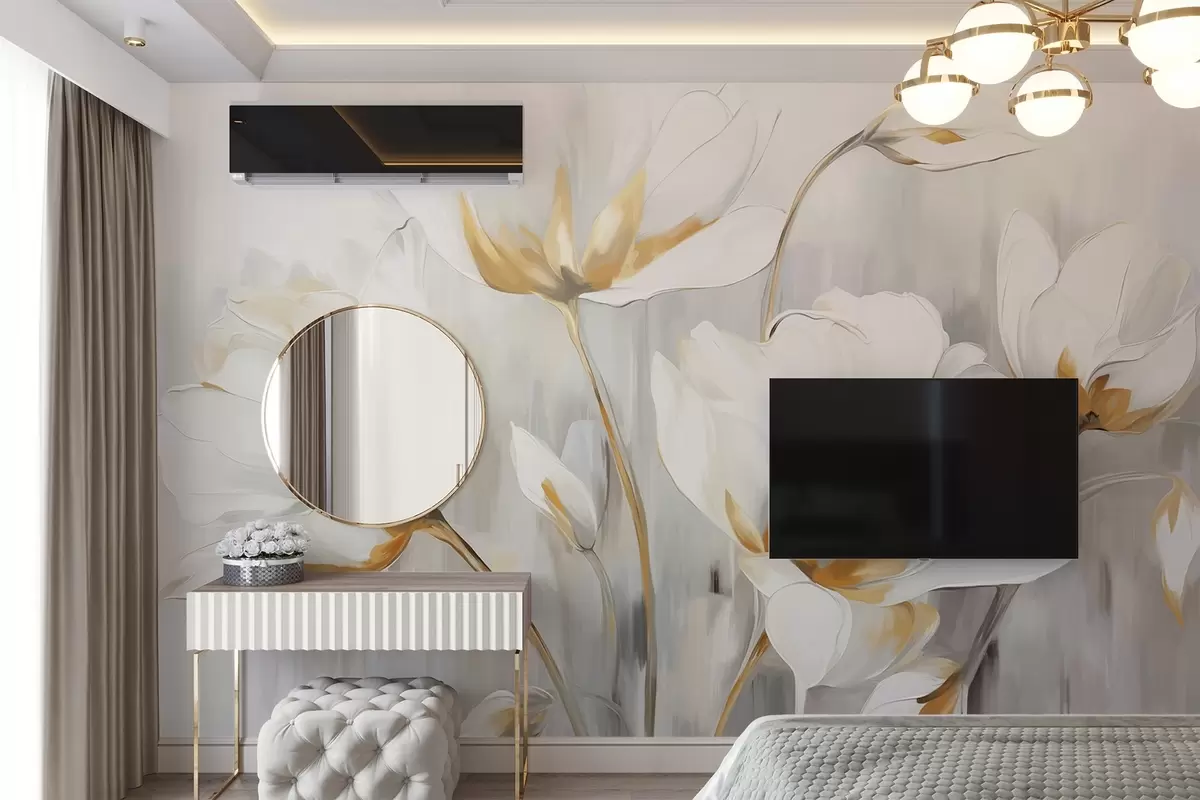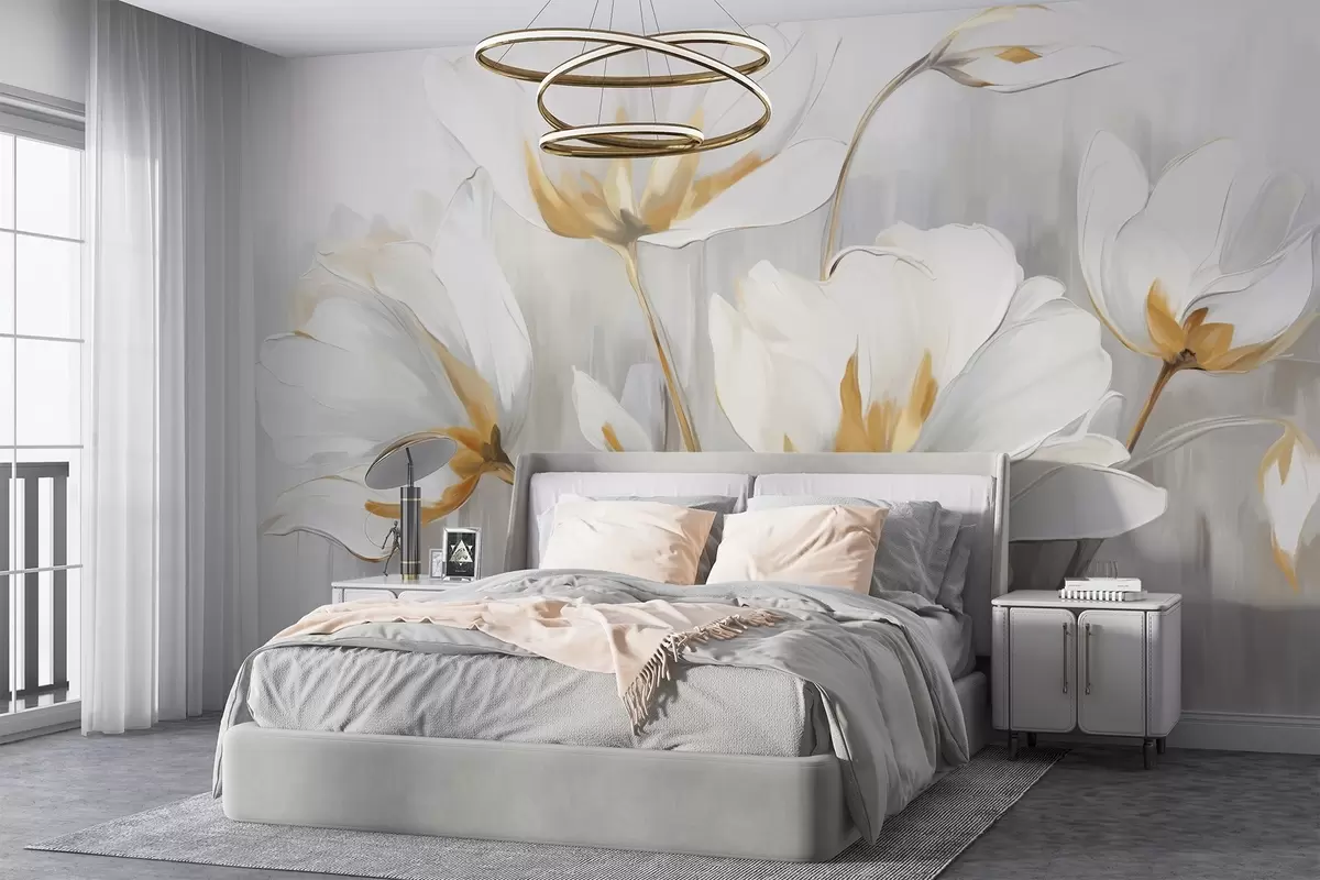 White abstract flowers with white petals and stems on a gray background with gray and white vertical brushstrokes - Wall mural (No. w09047)