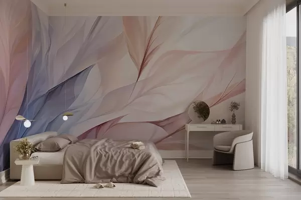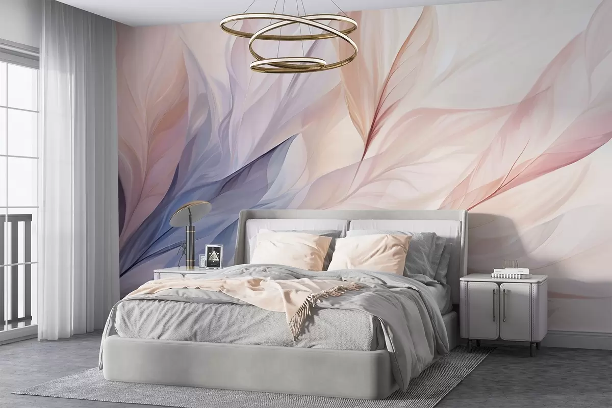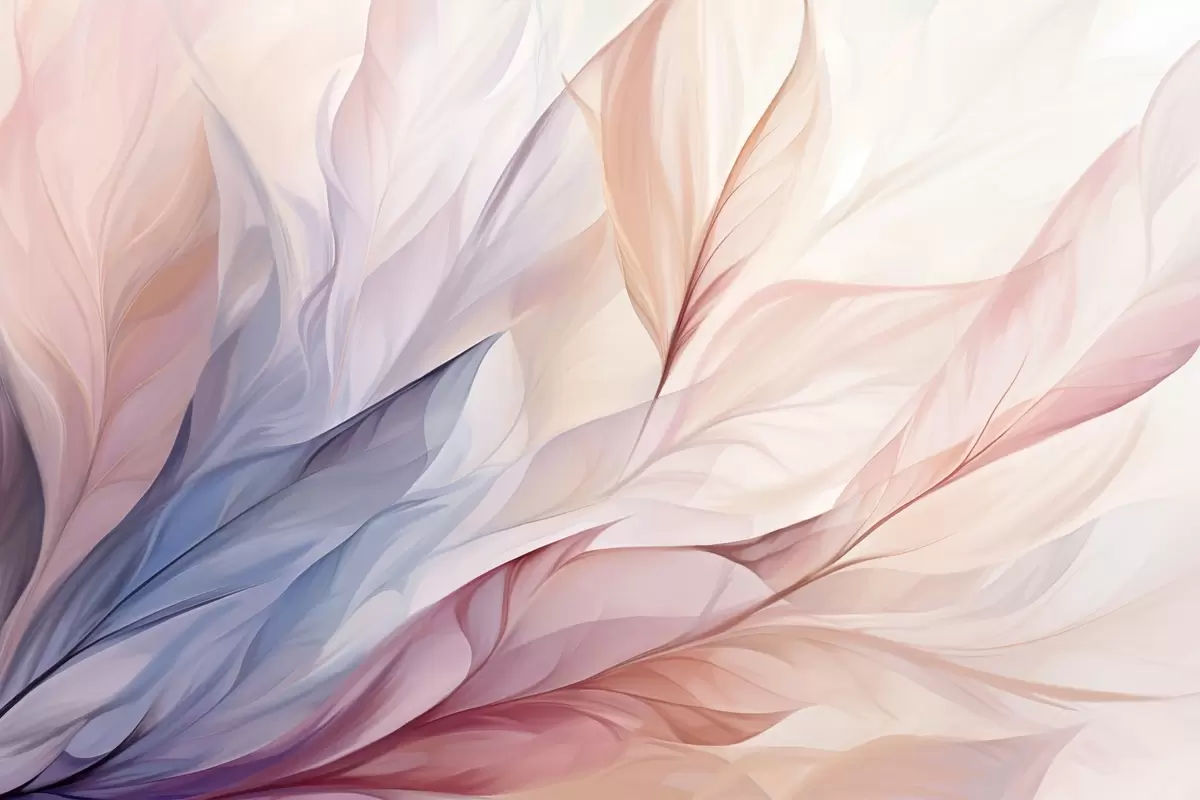Abstract floral design with flowing petals in pastel shades of pink, peach, and blue, creating a soft and dreamy composition - Wall mural (No. w09049)