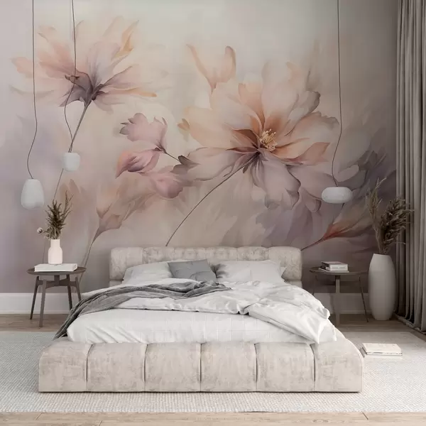 wall murals A delicate floral art with large pastel-colored flowers with translucent petals, soft stems, and a gentle diffused background  w09050