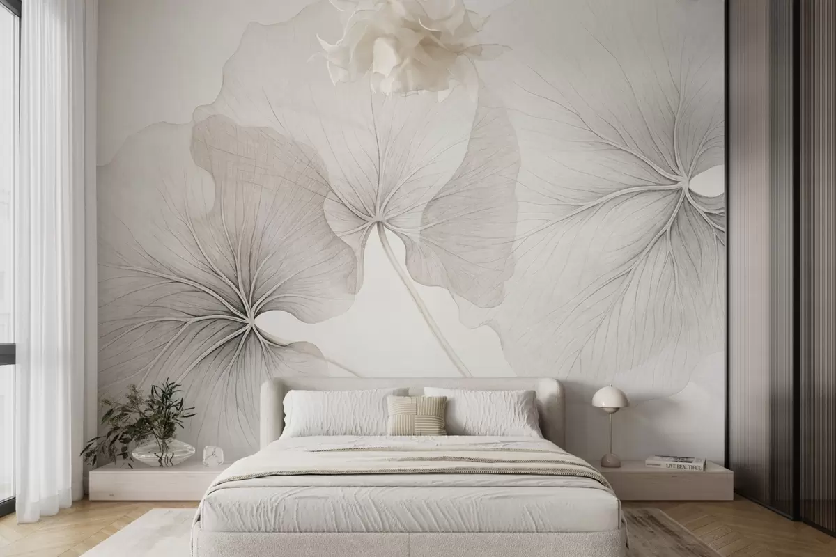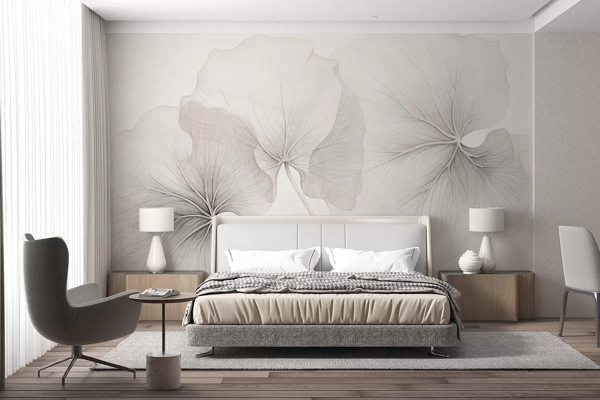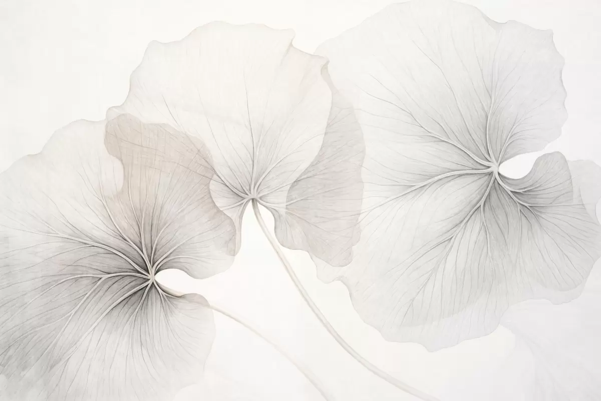 Three translucent leaves with visible veins, with noise texture overlapping slightly, with thin stems on a white background - Wall mural (No. w09052)