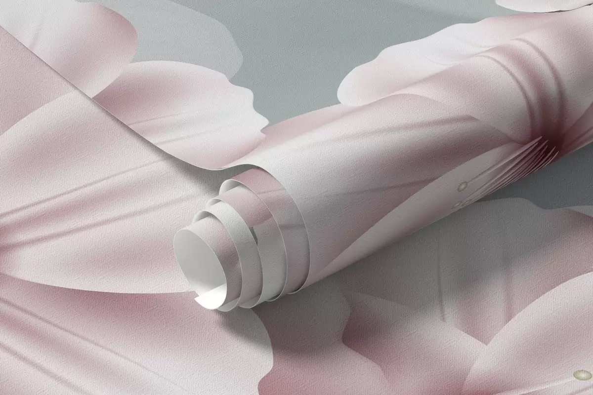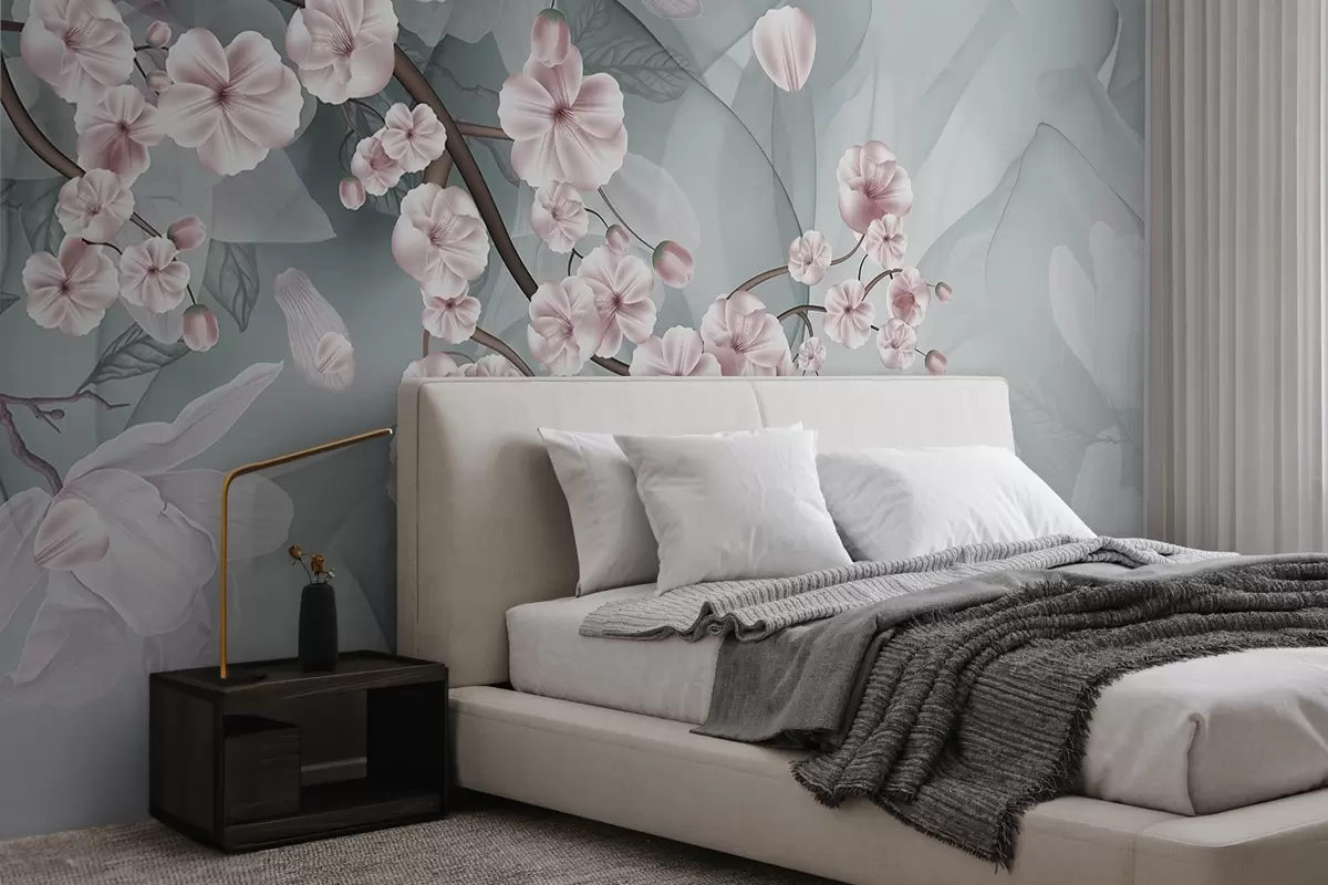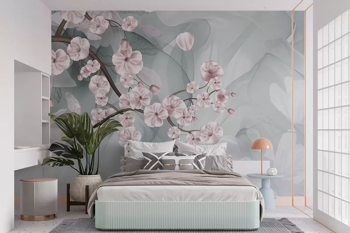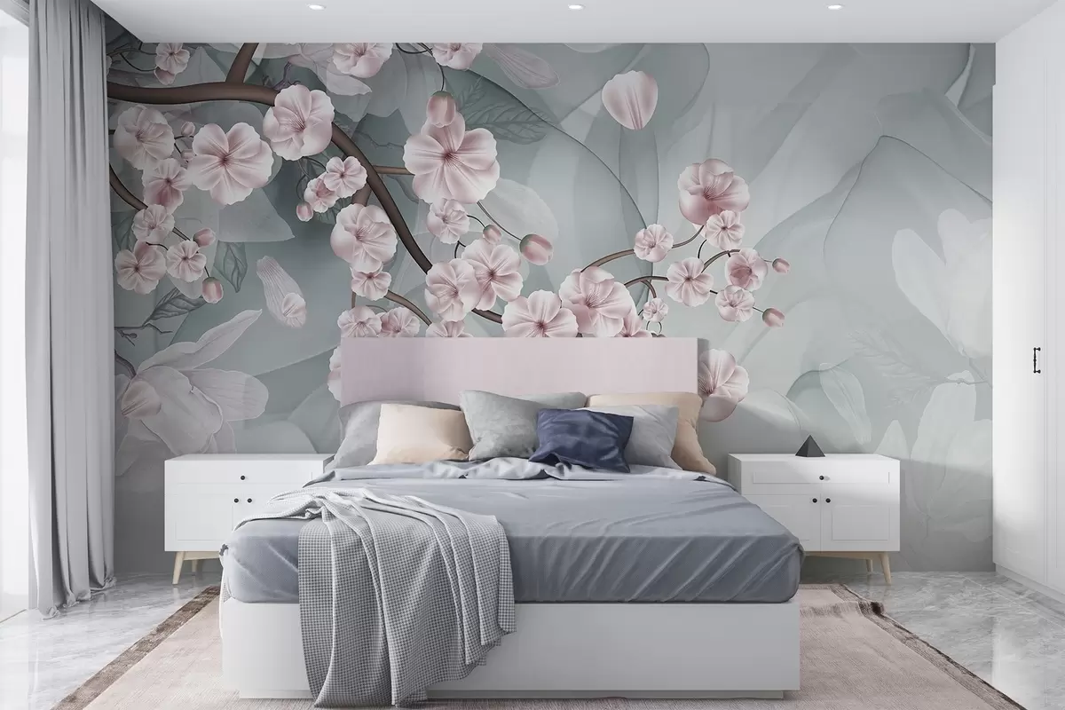 Cherry blossom branches with pink flowers and petals, brown branches, abstract muted background with flowing effect - Wall mural (No. w09054)