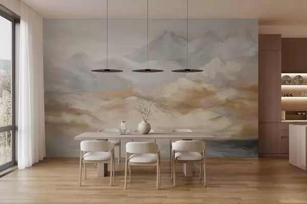 wall murals Textured landscape painting of mountains with a lake in the foreground, in shades of white, gray, and brown w09057