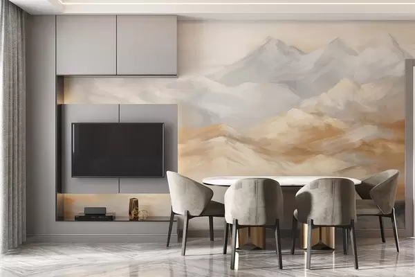 Textured landscape painting of mountains with a lake in the foreground, in shades of white, gray, and brown - Wall mural (No. w09057)