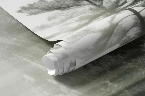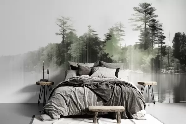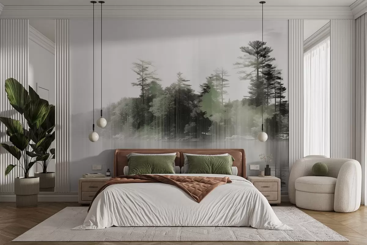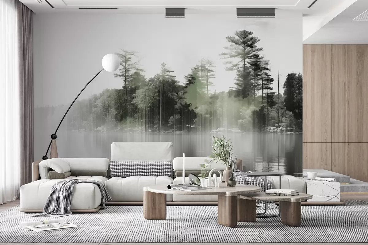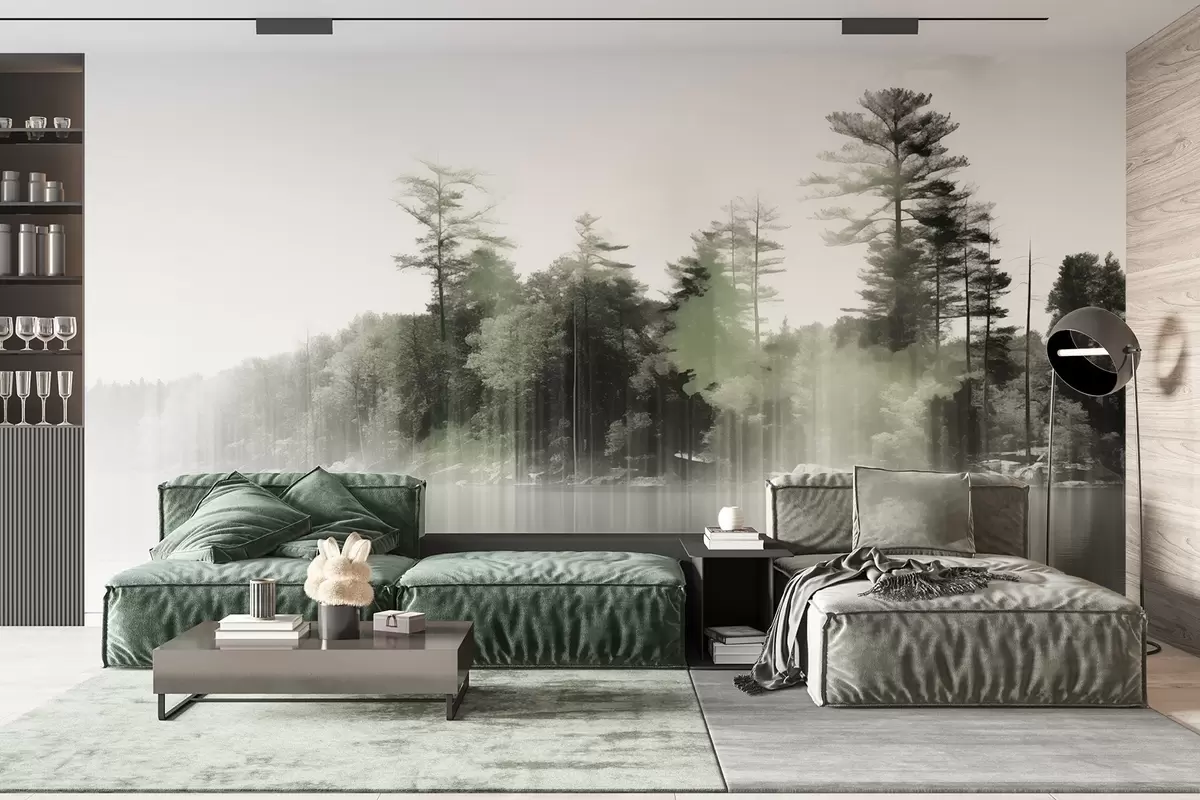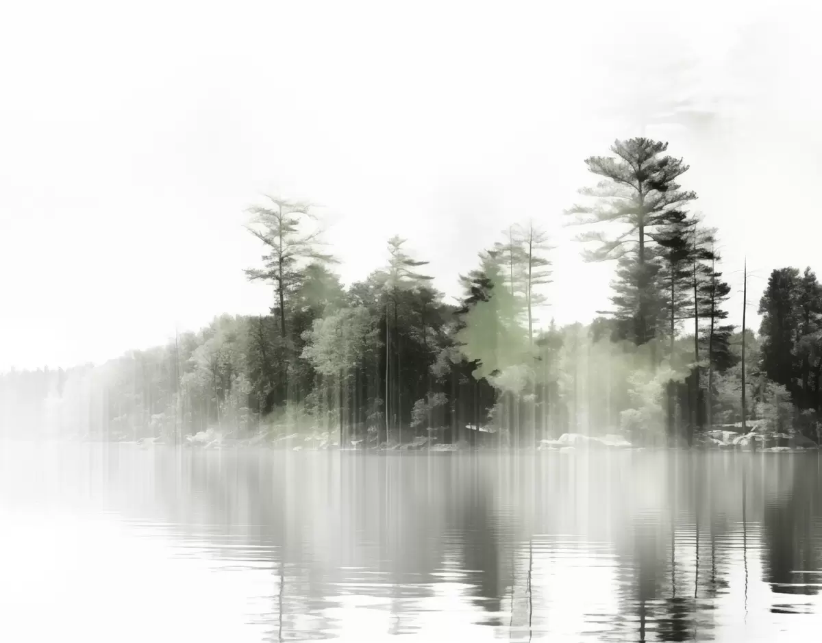 Abstract minimalism textured landscape with a lake and trees reflections in the water in green and white shades - Wall mural (No. w09058)