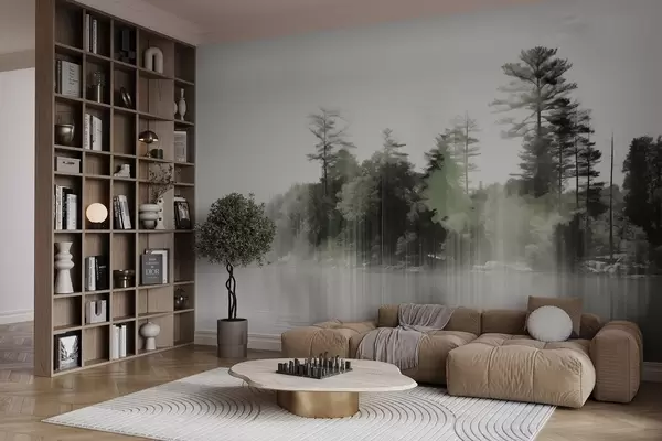 Abstract minimalism textured landscape with a lake and trees reflections in the water in green and white shades - Wall mural (No. w09058)