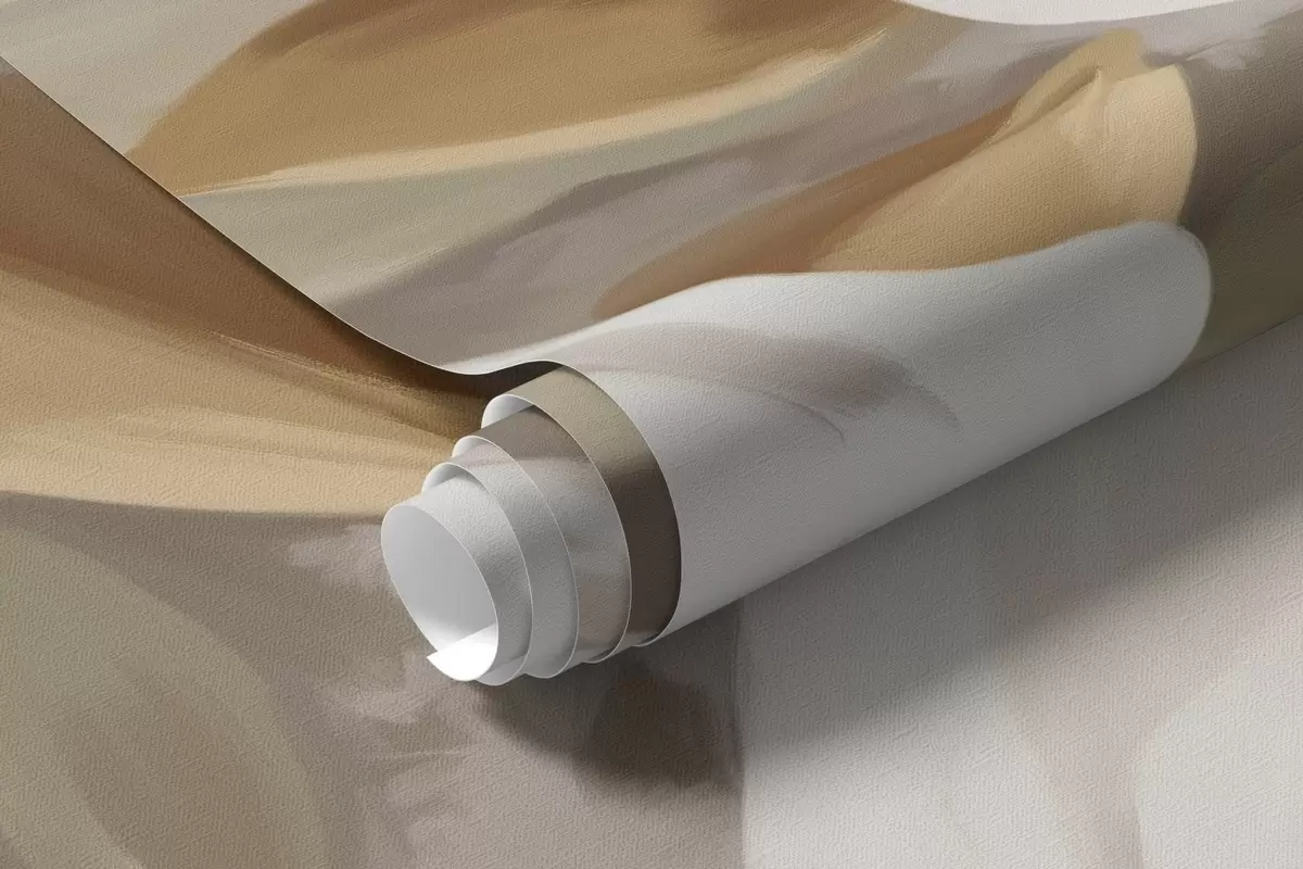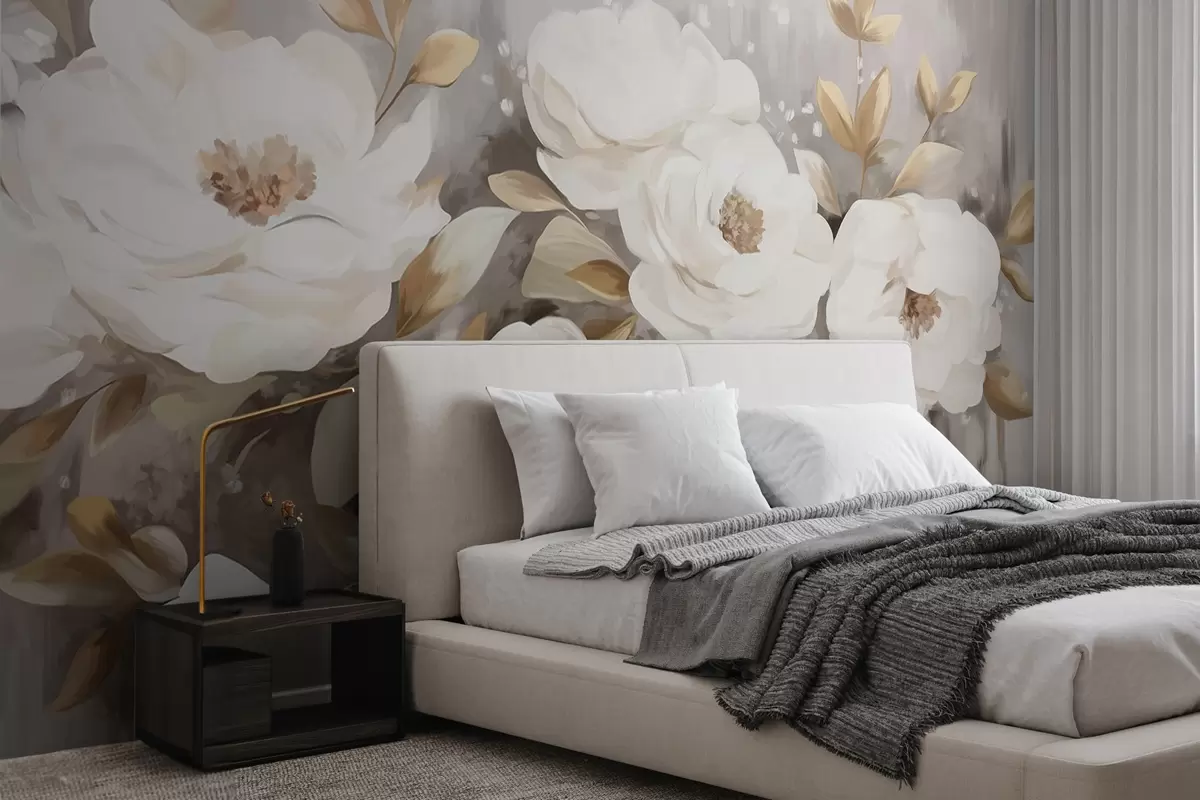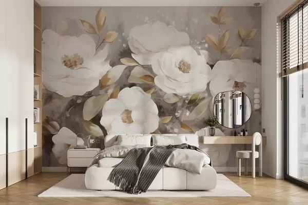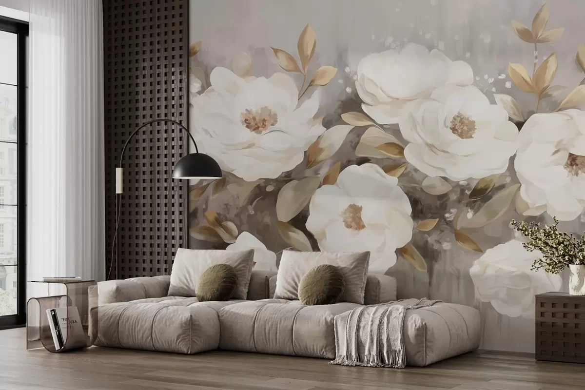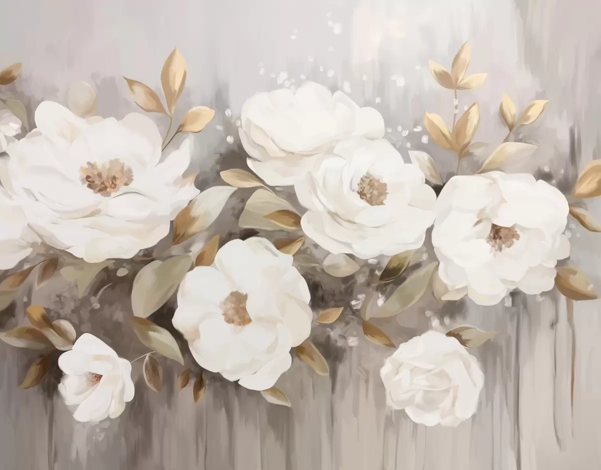 White flowers with yellow leaves, soft petals, delicate floral arrangement, neutral color palette, textured brushstrokes - Wall mural (No. w09062)