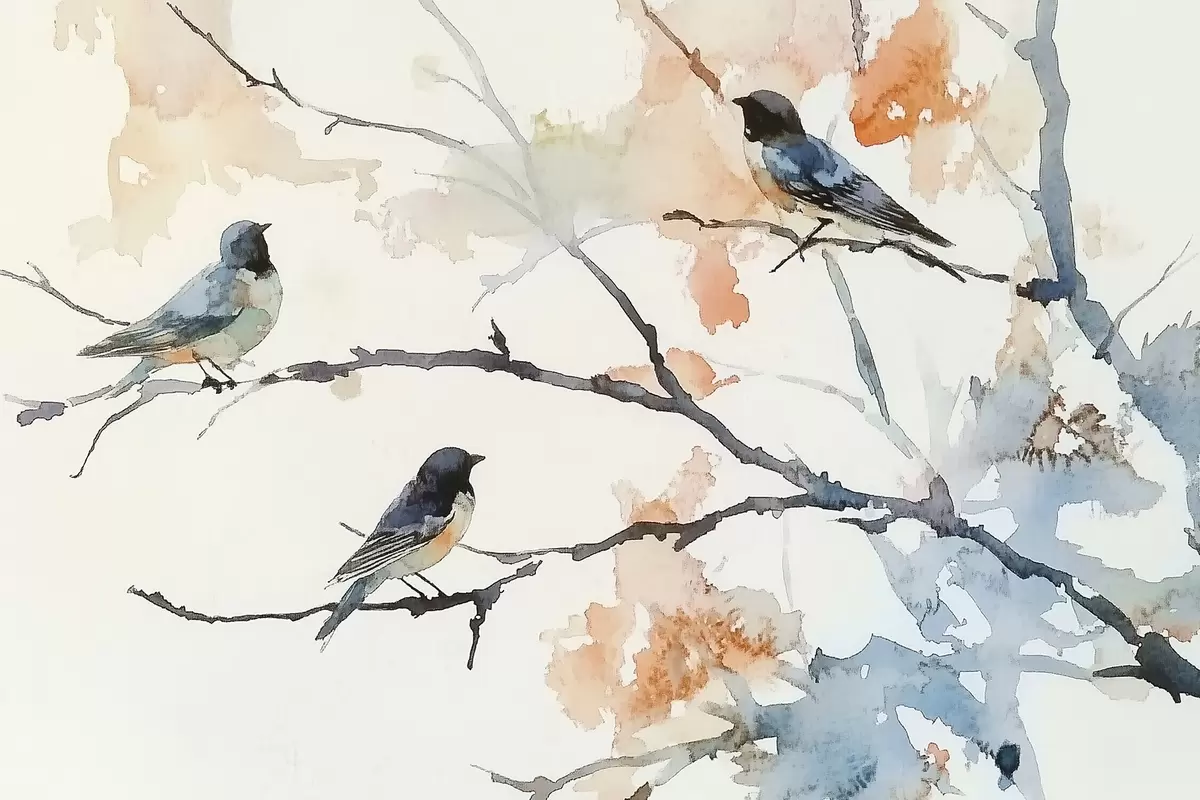 Birds on tree branches in watercolor style - Wall mural (No. w09064)