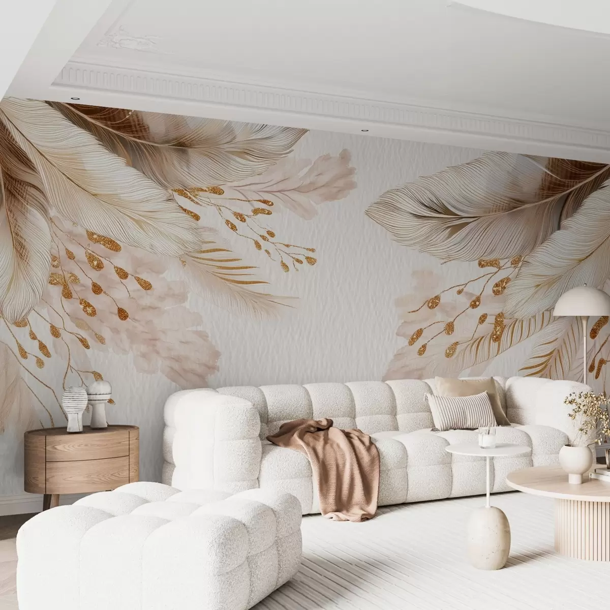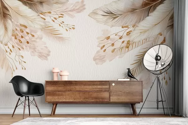 Pampas grass and feathers in watercolor style in beige and white on paper - Wall mural (No. w09079)