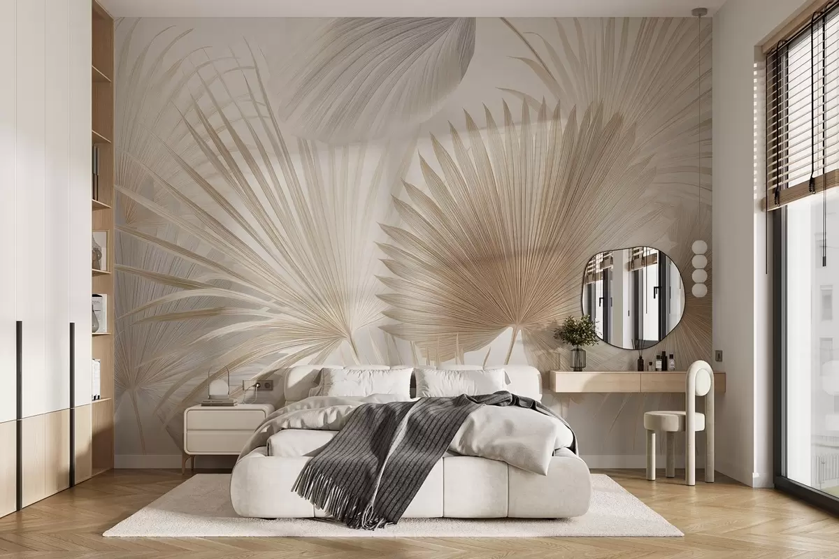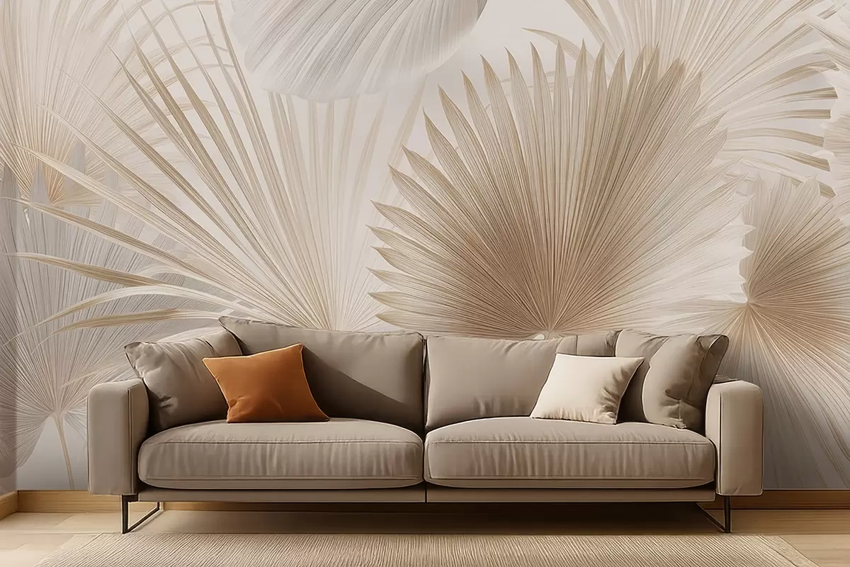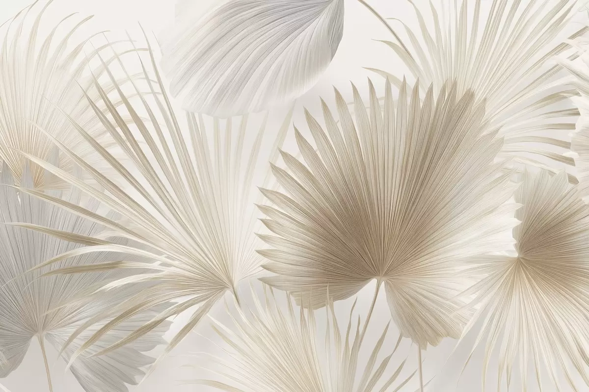 Soft tropical leaf fans in light beige and bluish tones - Wall mural (No. w09084)