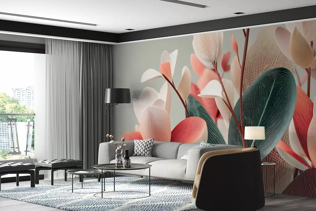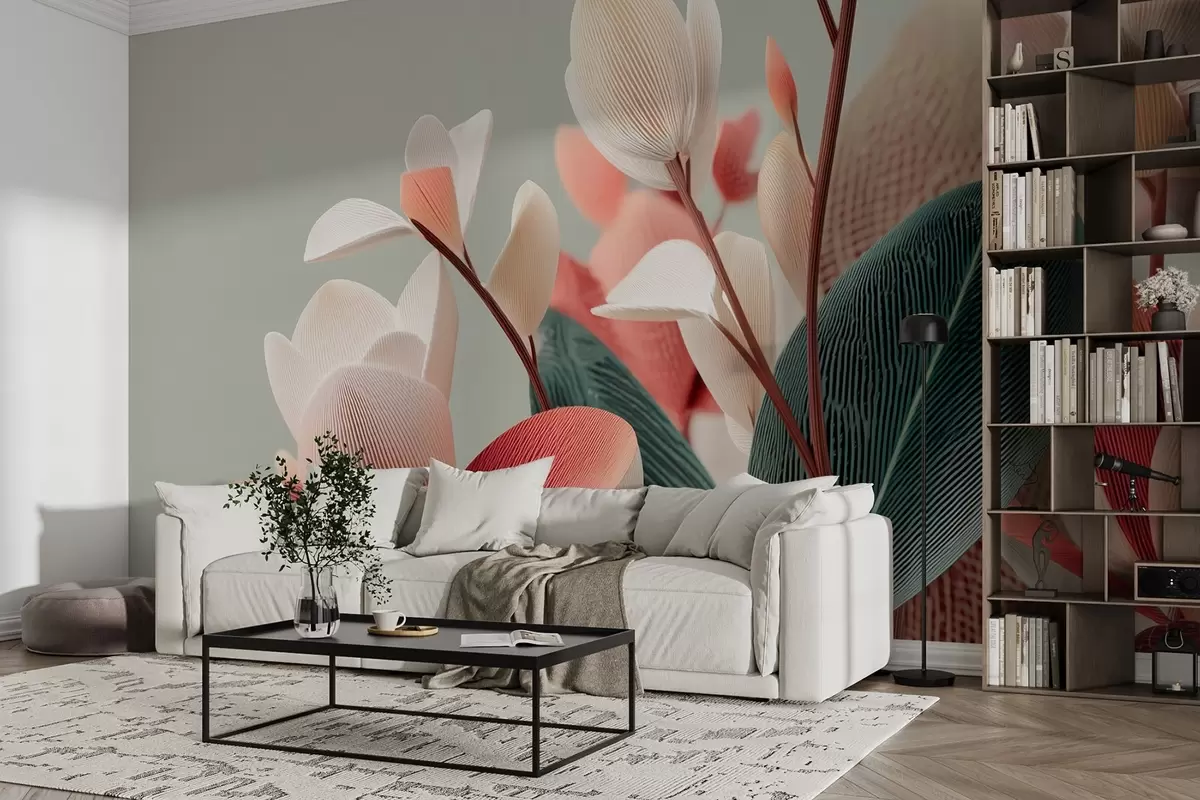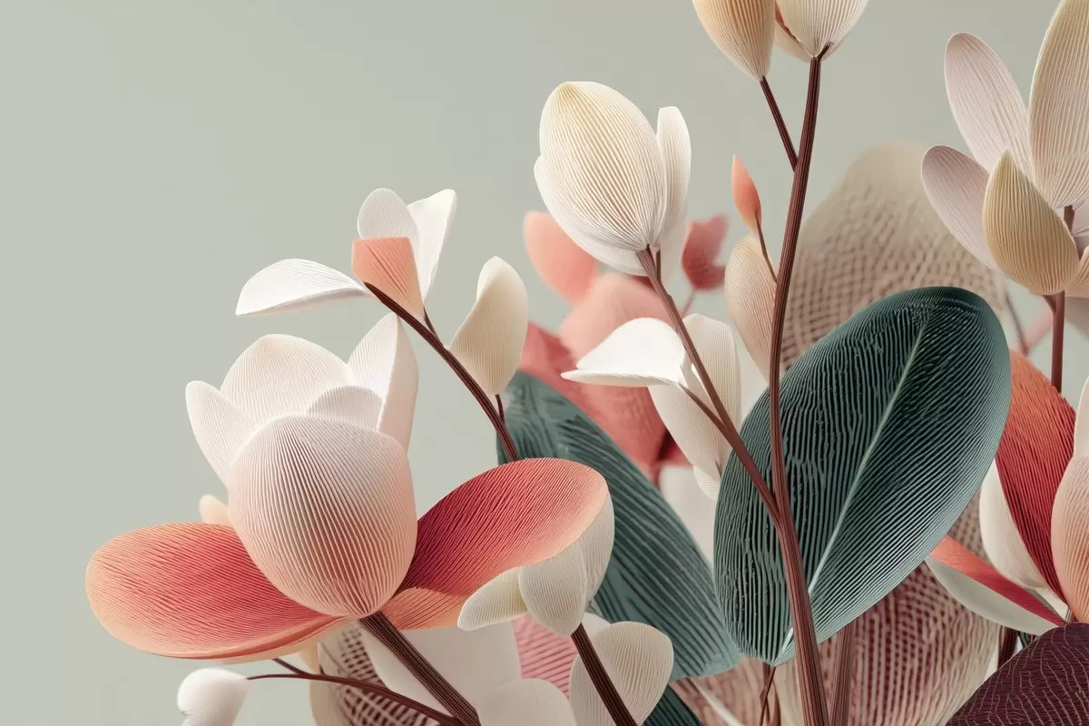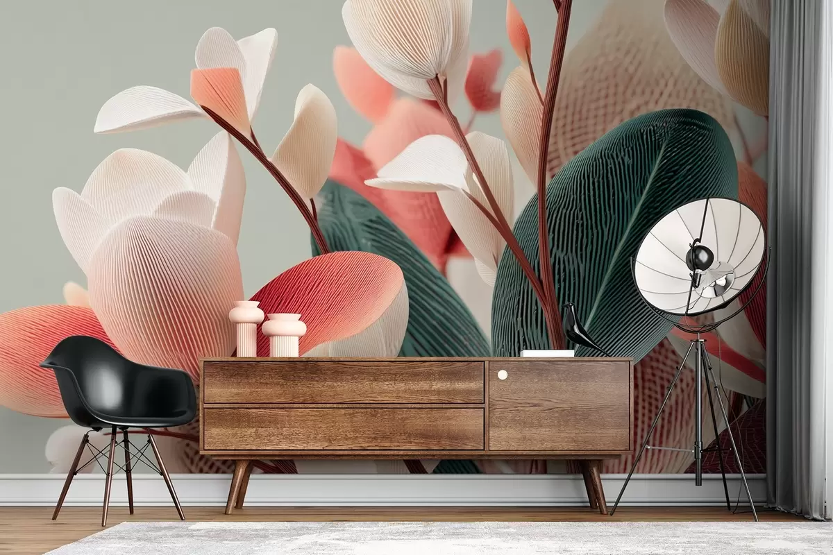 Textured flowers and leaves in pastel and green tones - Wall mural (No. w09094)