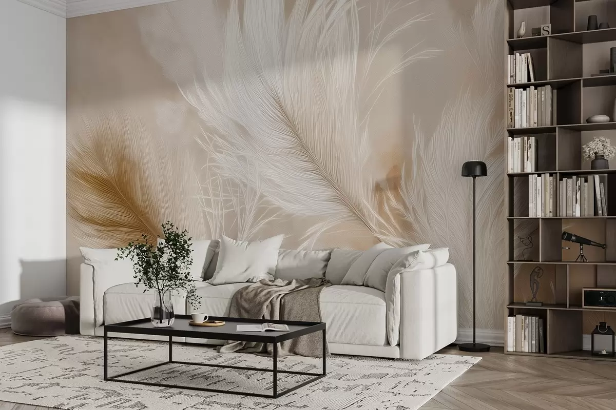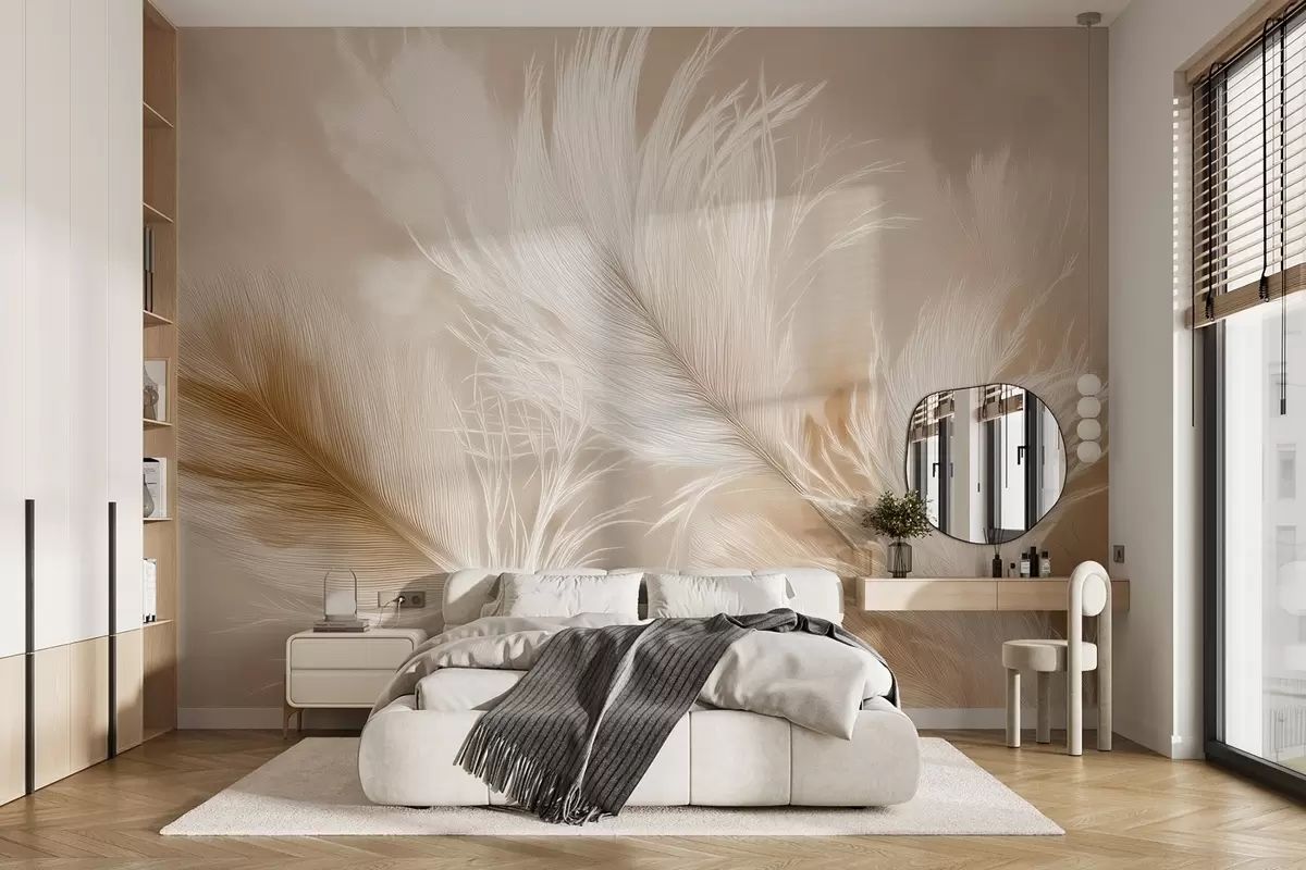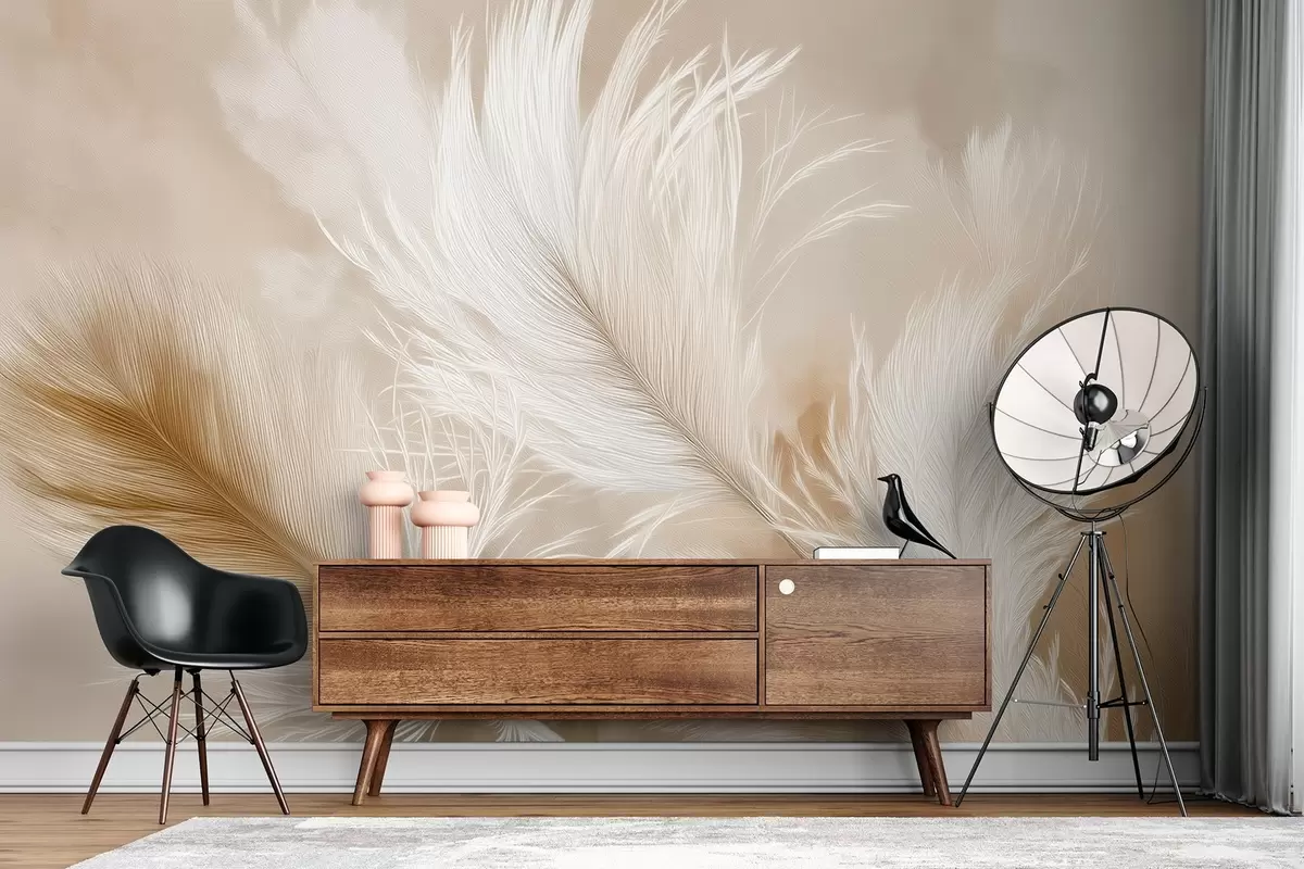 Flying airy feathers on a beige background - Wall mural (No. w09102)