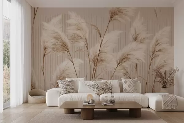 Pampas grass against a background of lines in beige tones - Wall mural (No. w09104)