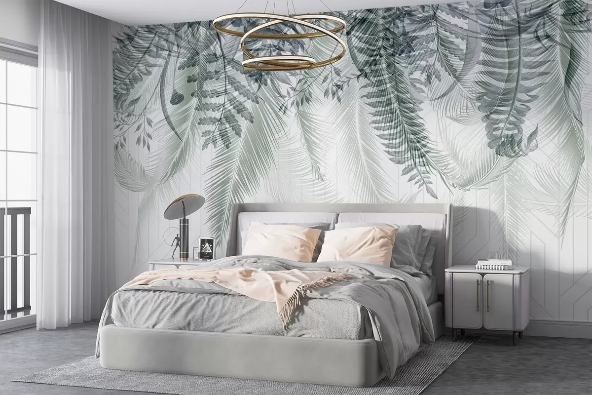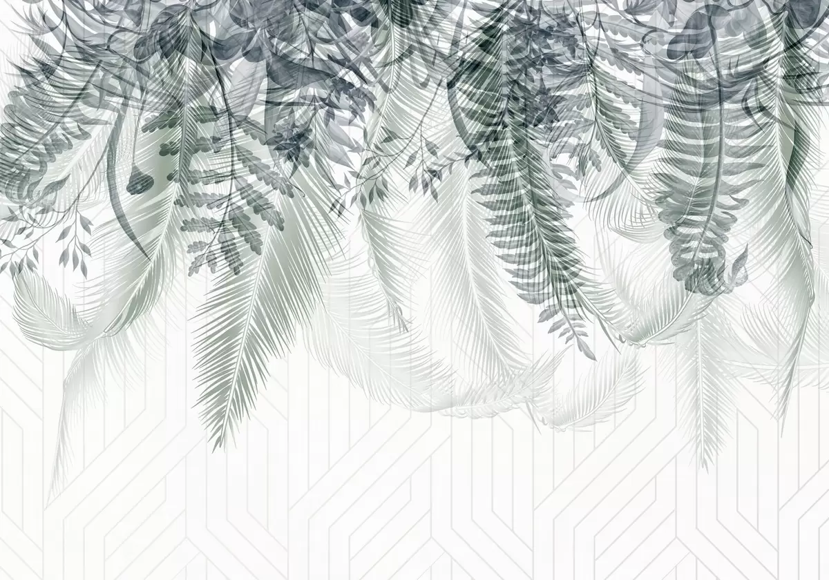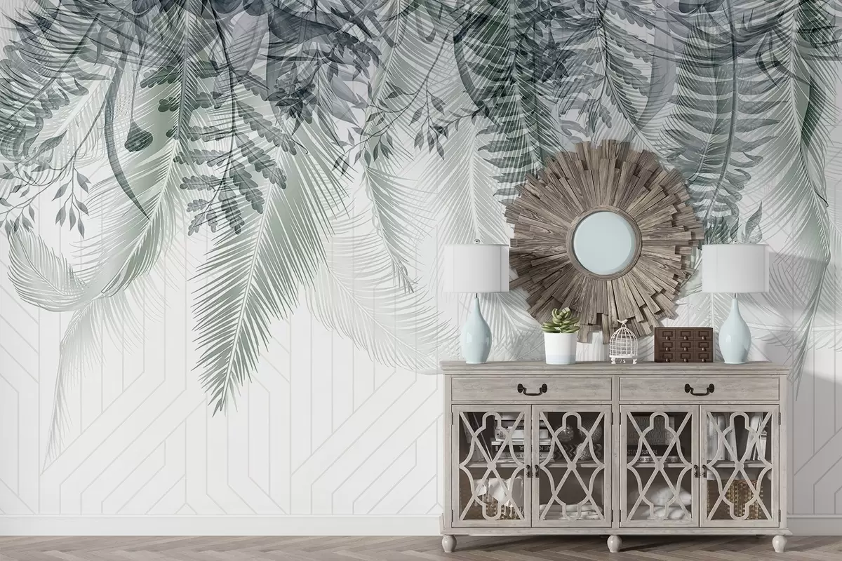 Delicate falling tropical fern and palm leaves, geometric background, soft light, muted colors, elegant - Wall mural (No. w09106)