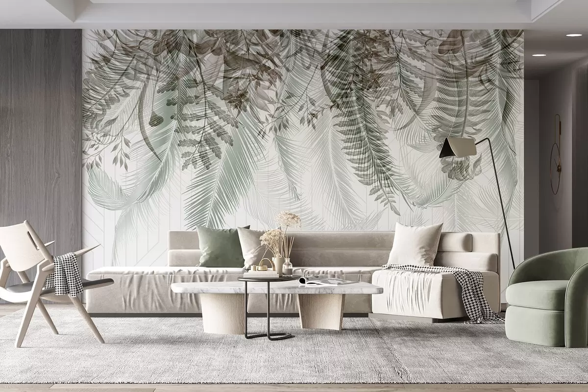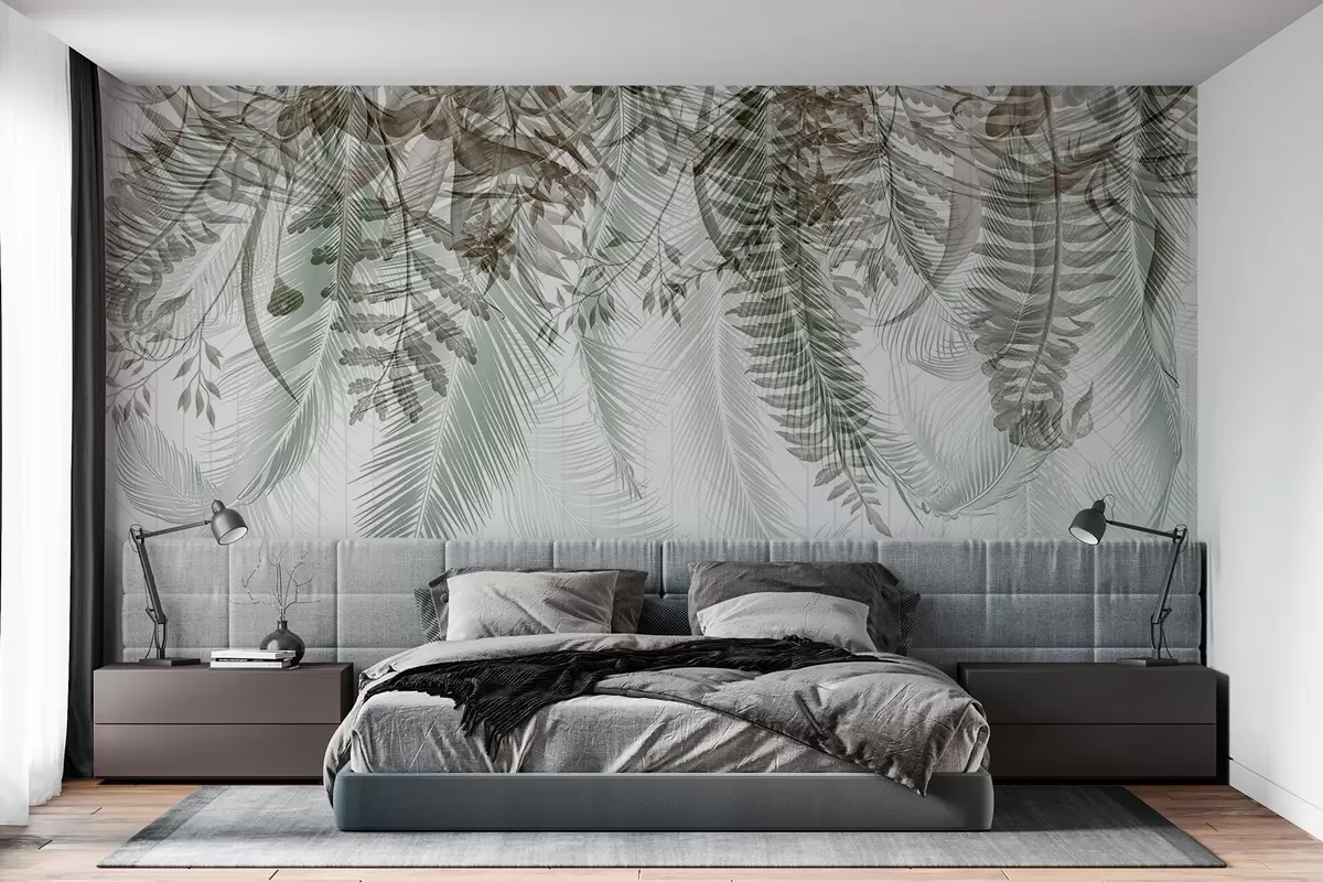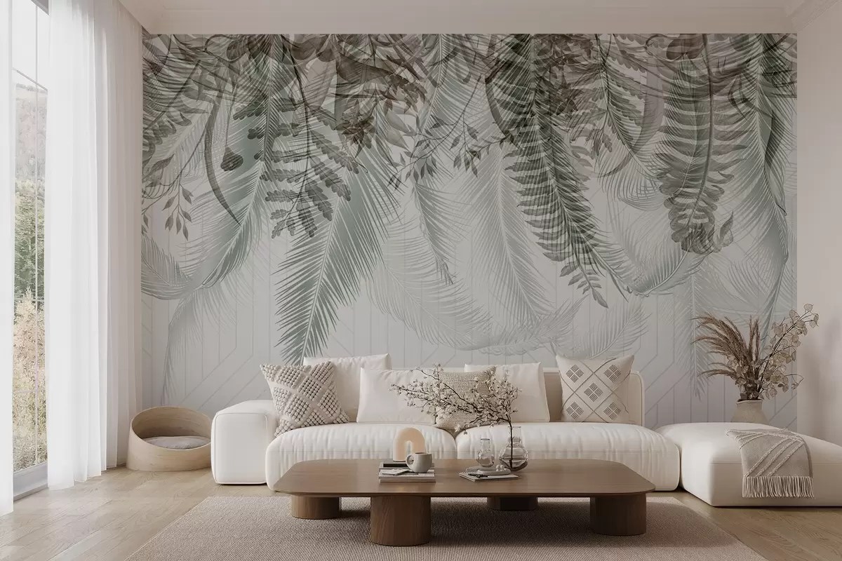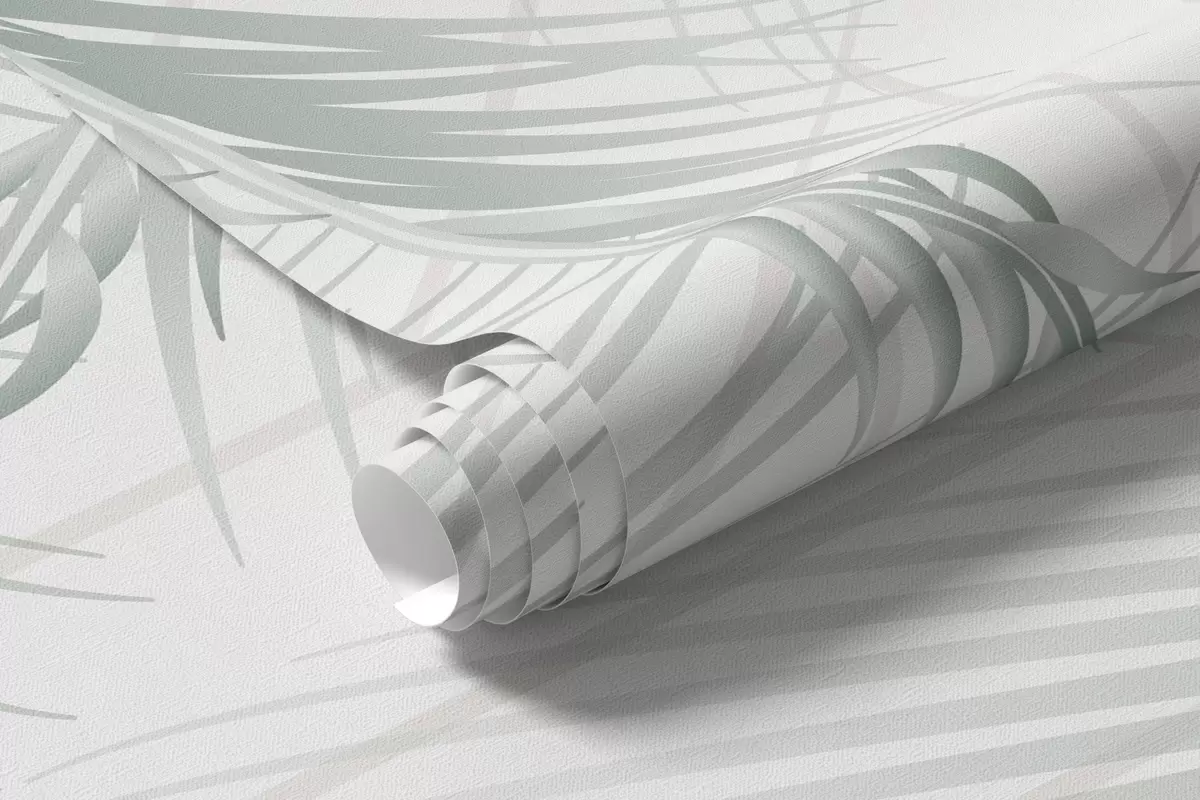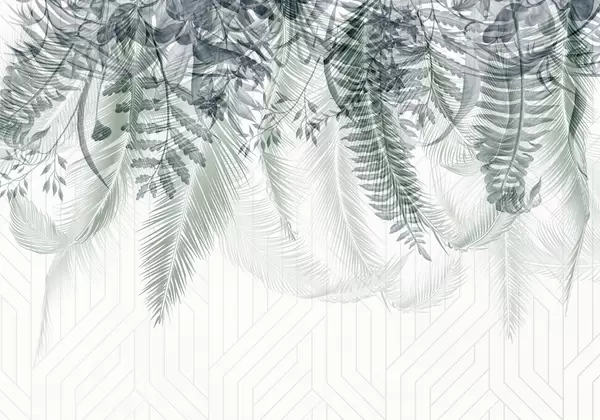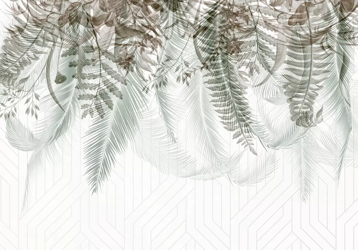 Delicate falling tropical fern and palm leaves, geometric background, soft light, muted colors, elegant - Wall mural (No. w09106v1)
