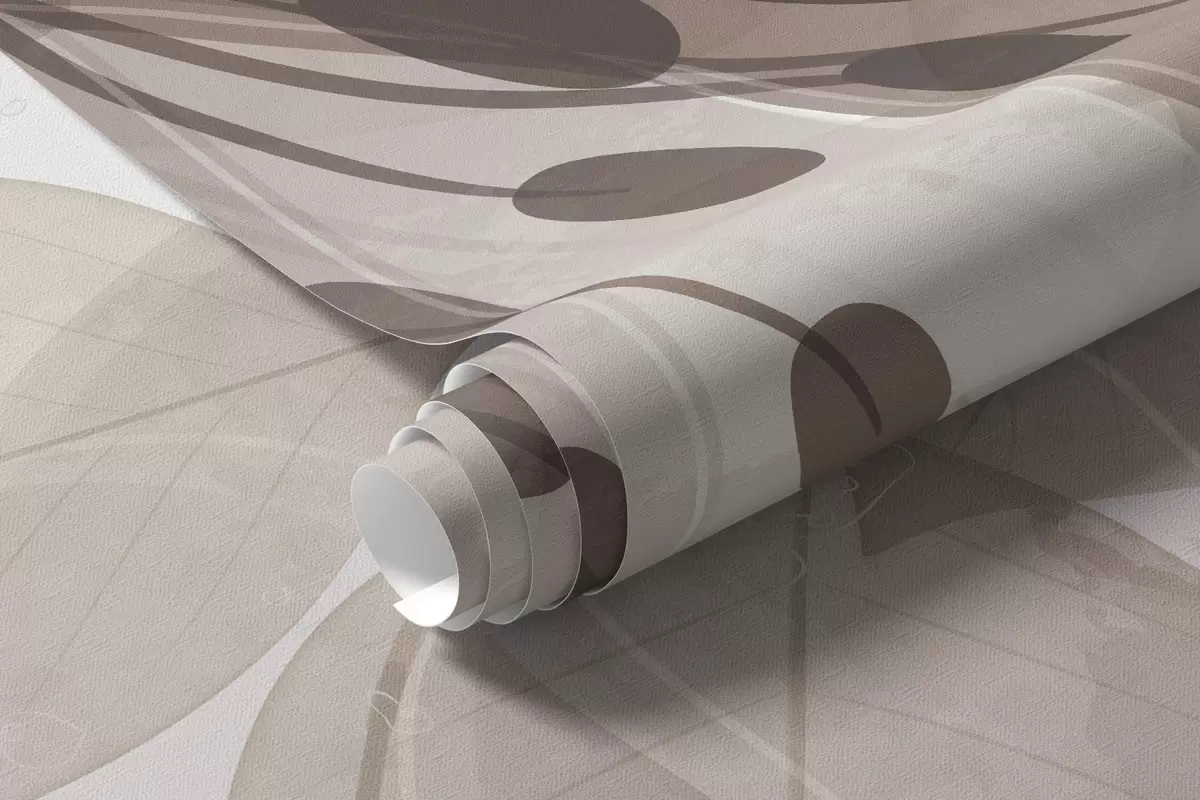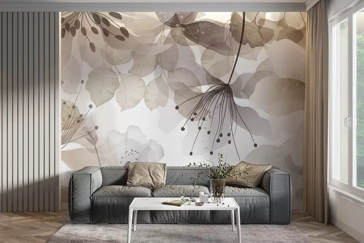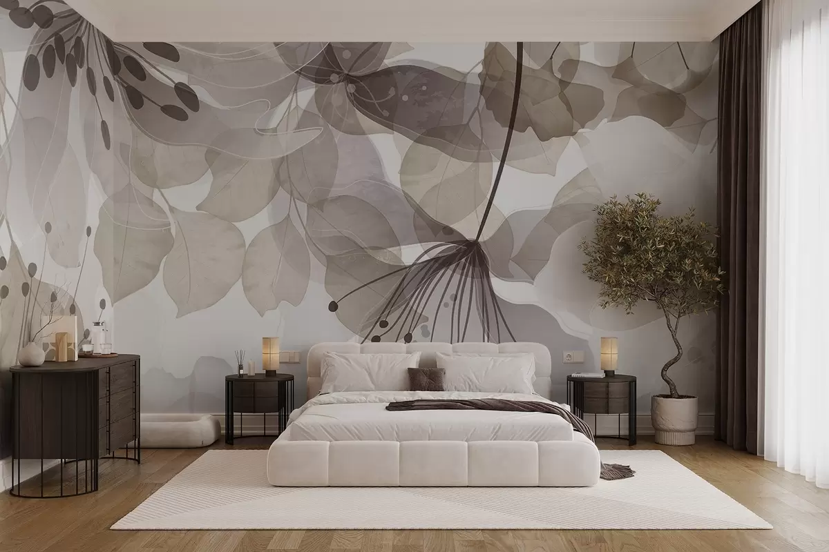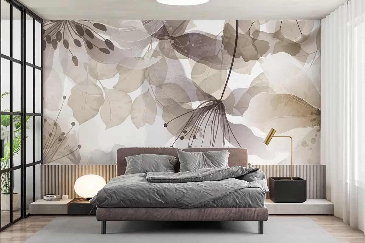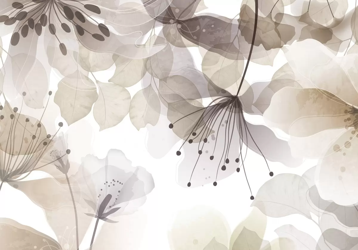 Flowers and leaves in beige colors, translucent petals and leaves, soft watercolor effect, delicate lines, white background - Wall mural (No. w09107v1)