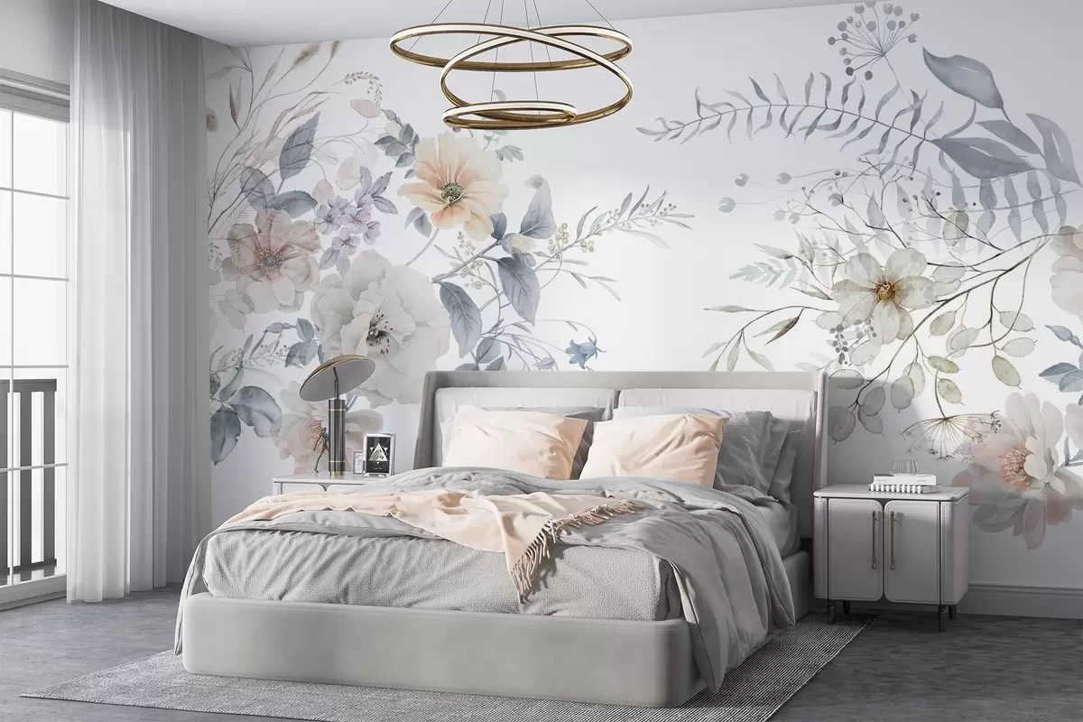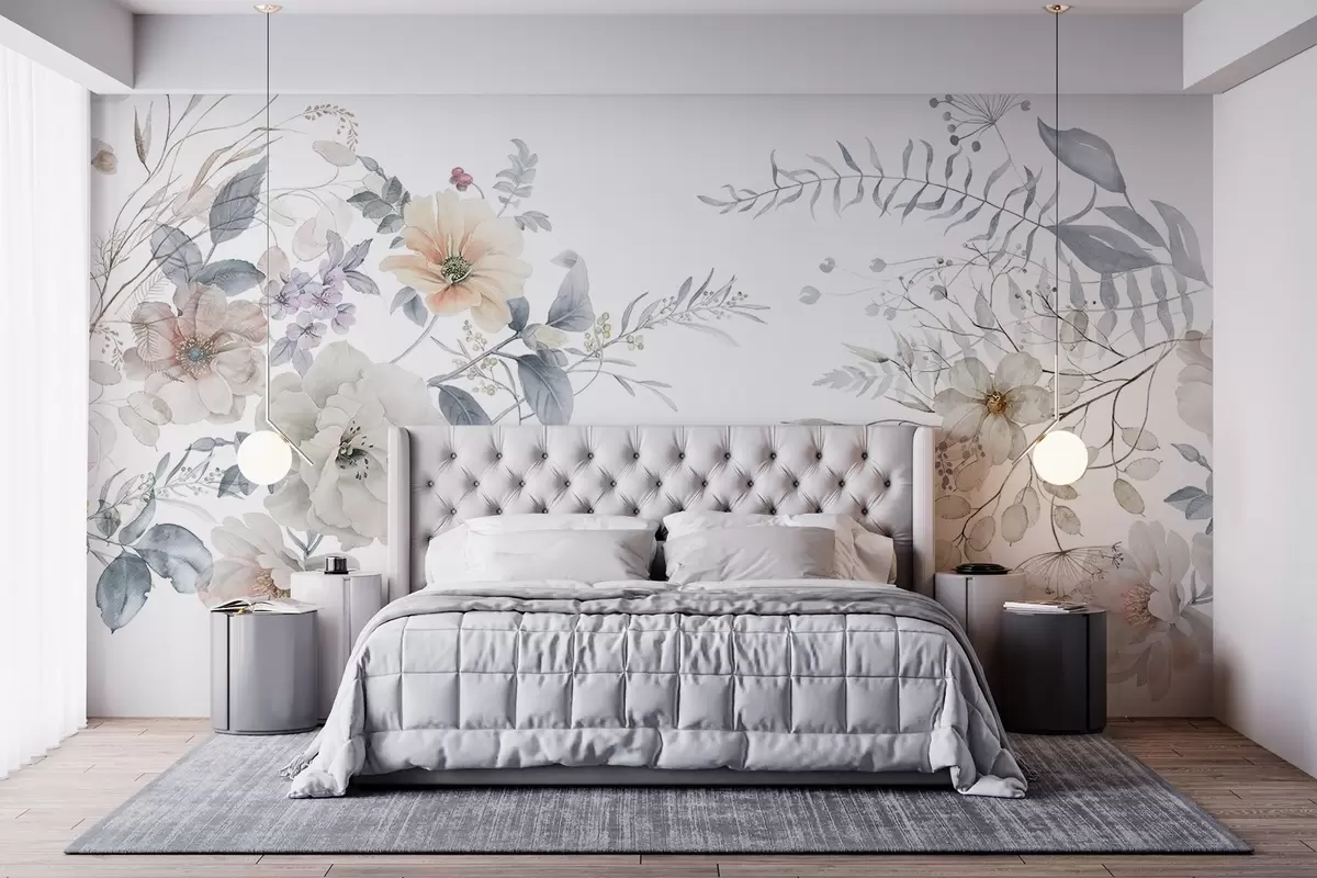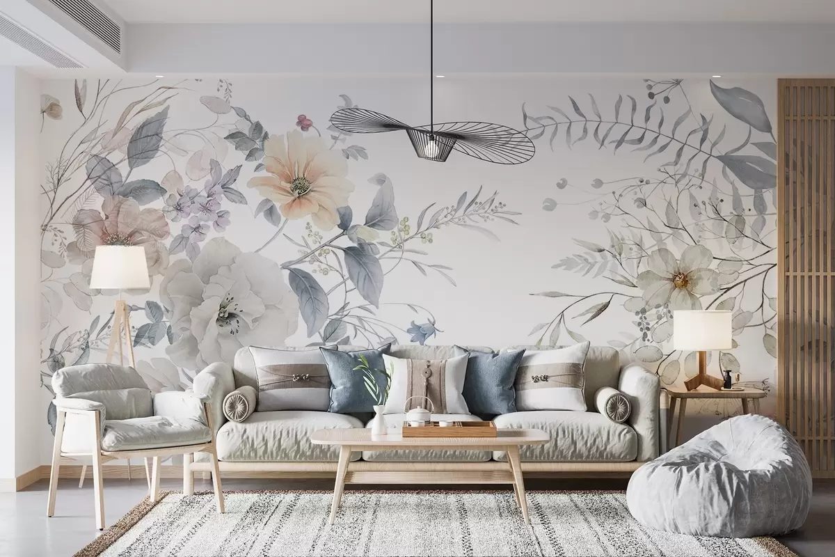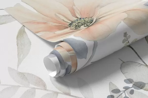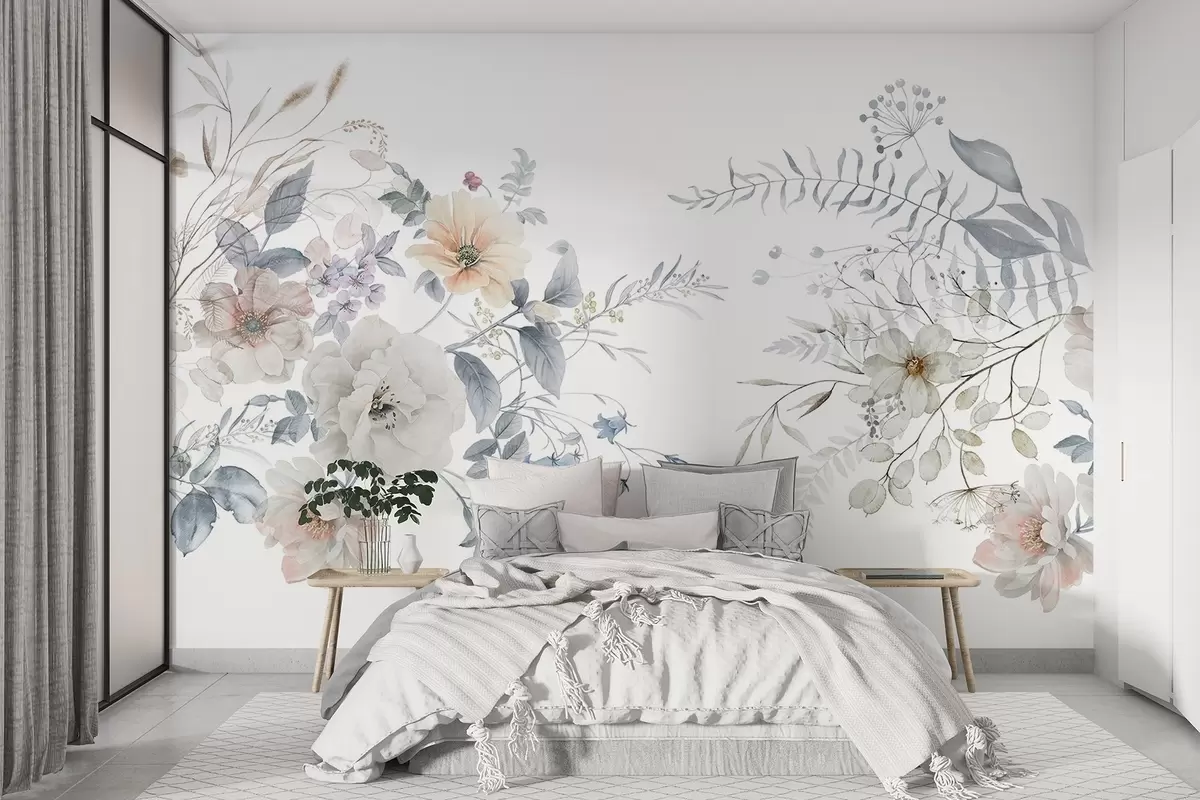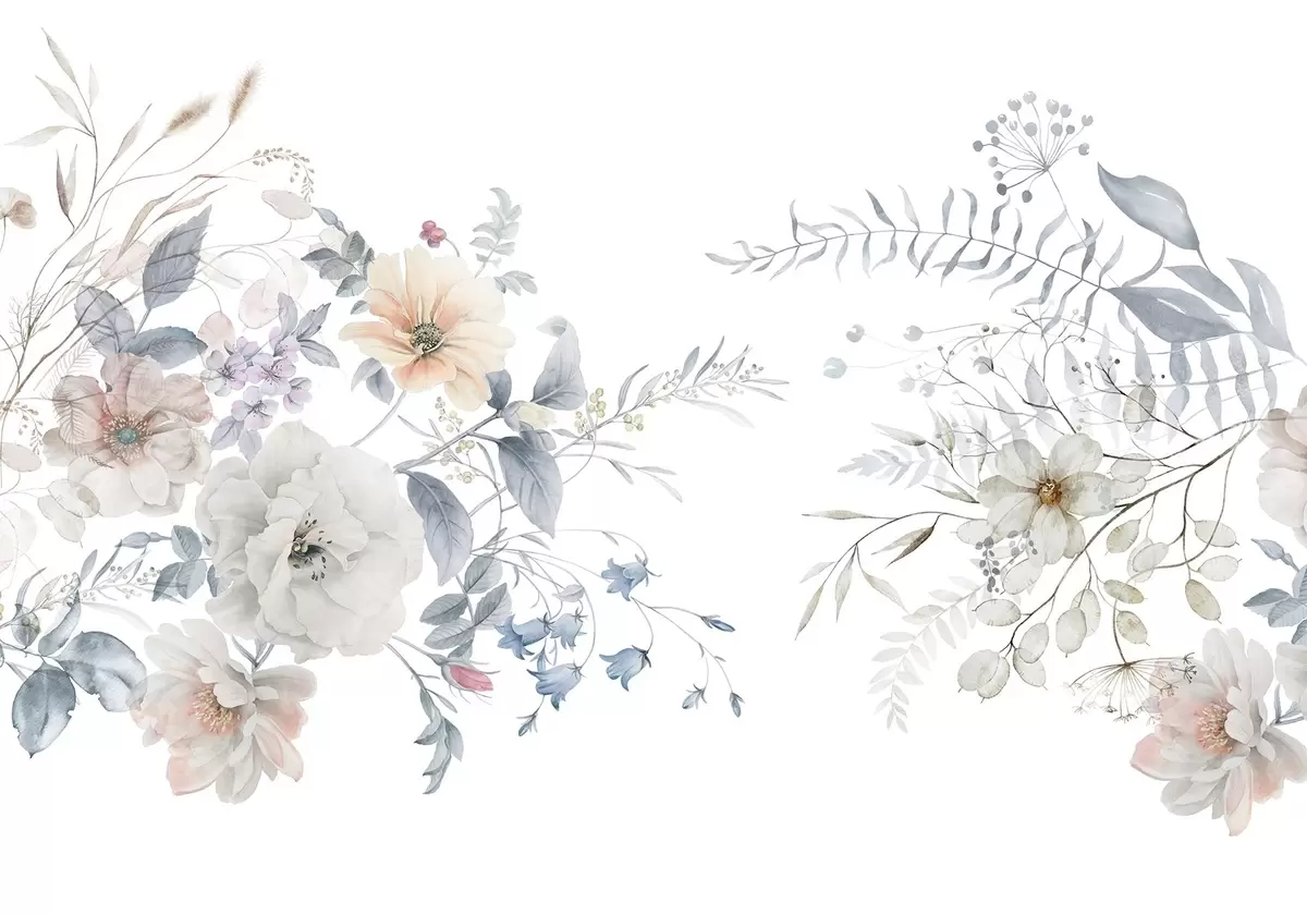 Floral arrangement in watercolor painting style with white, peach and blue flowers, delicate greenery on a white background - Wall mural (No. w09108)