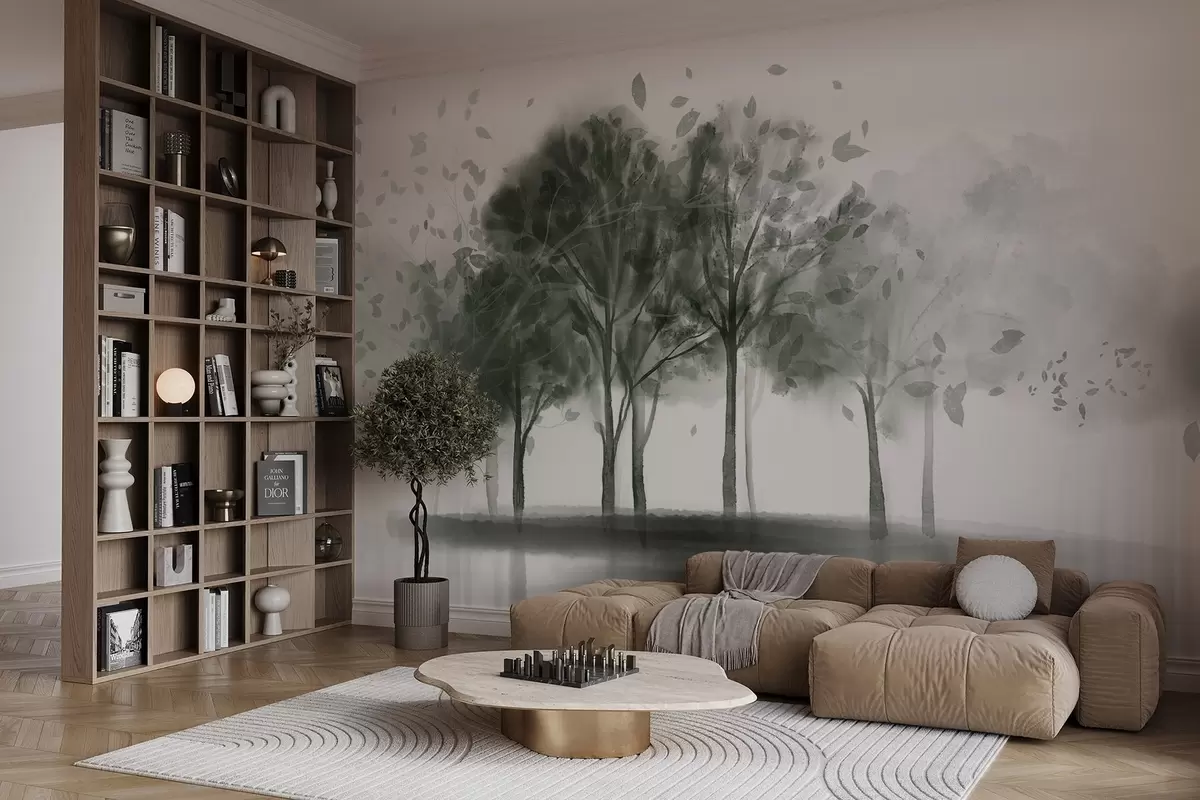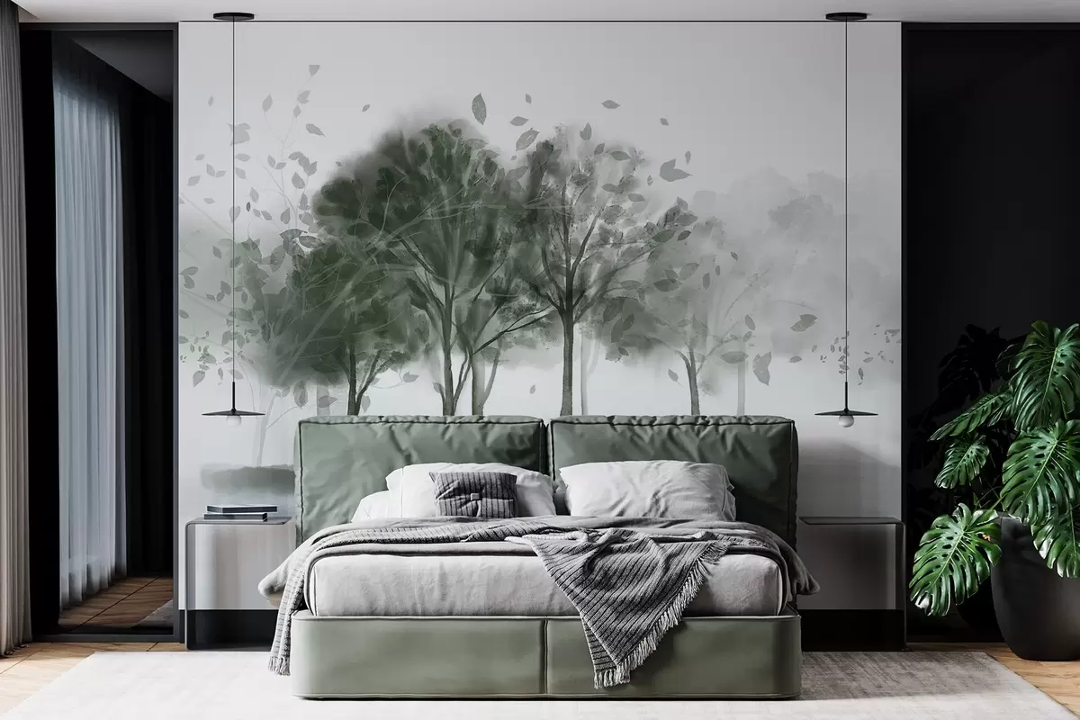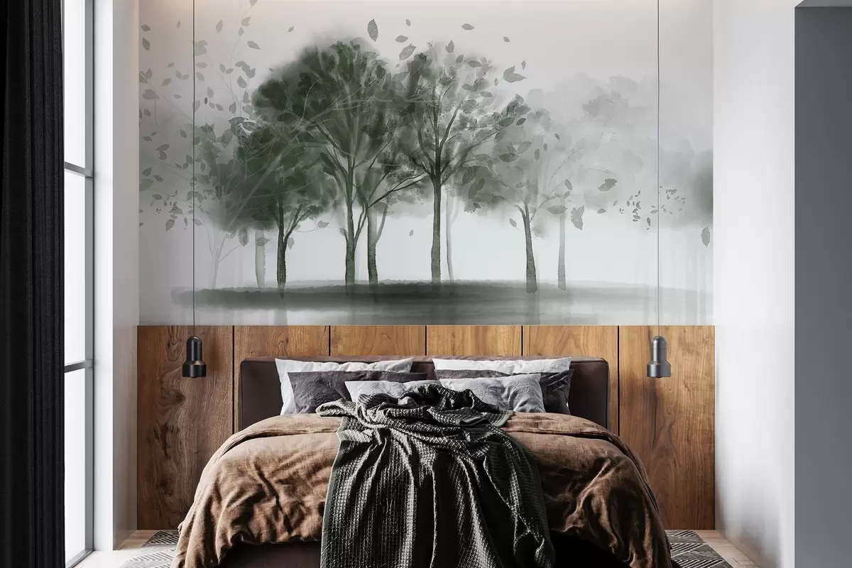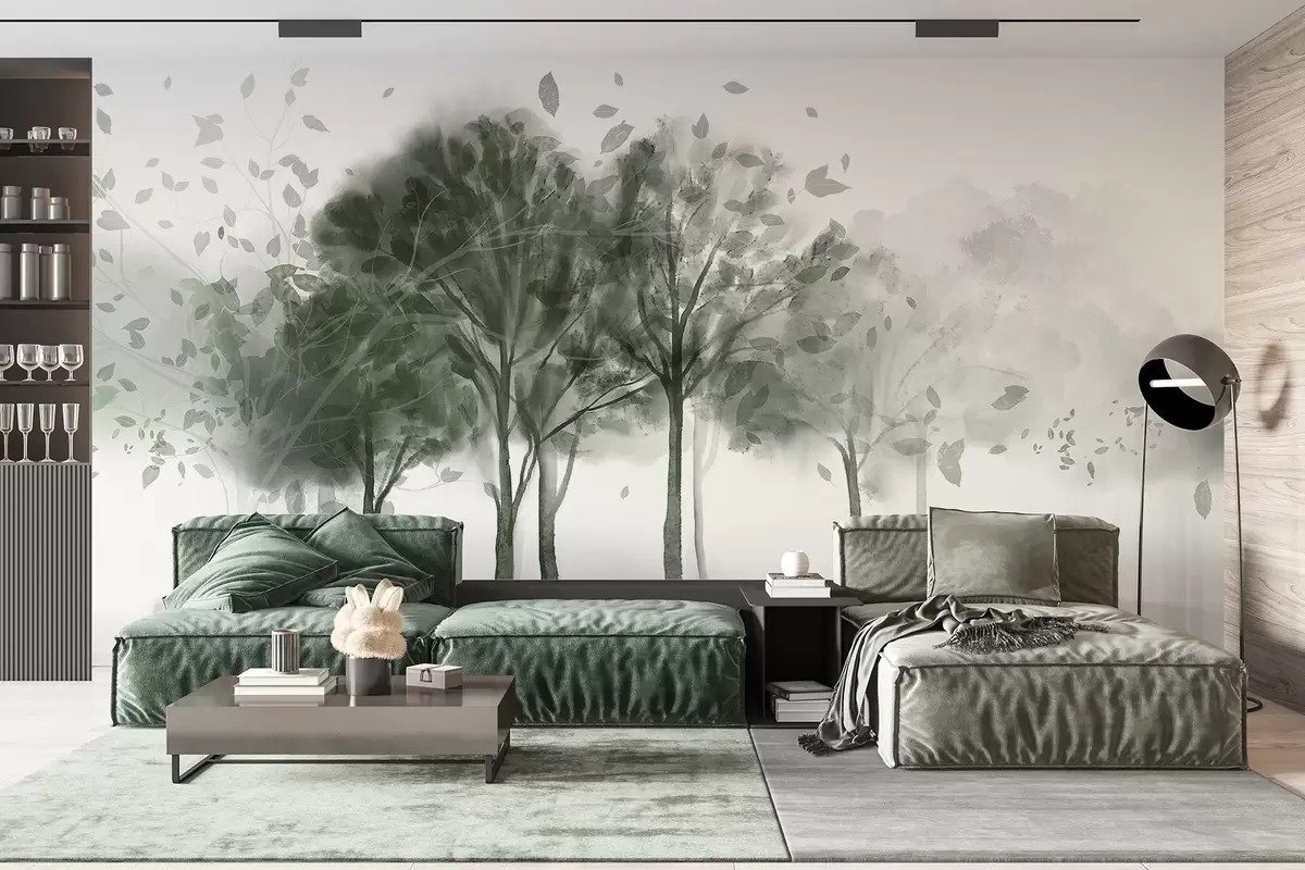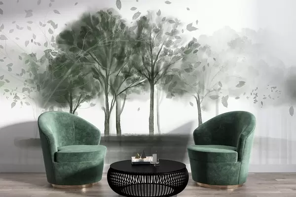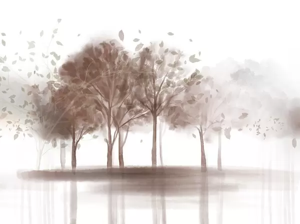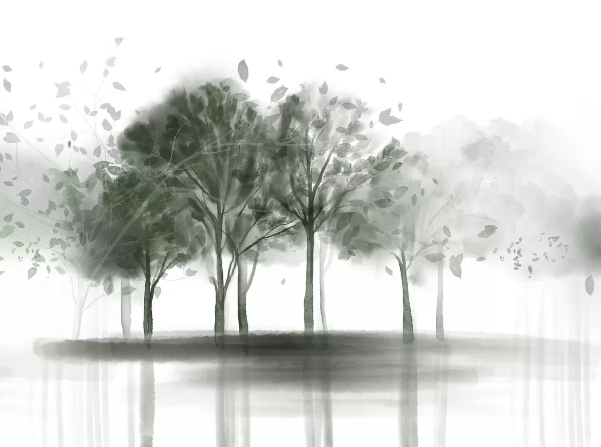 Abstract landscape with trees with green leaves reflecting in the water, in watercolor textured style - Wall mural (No. w09109)