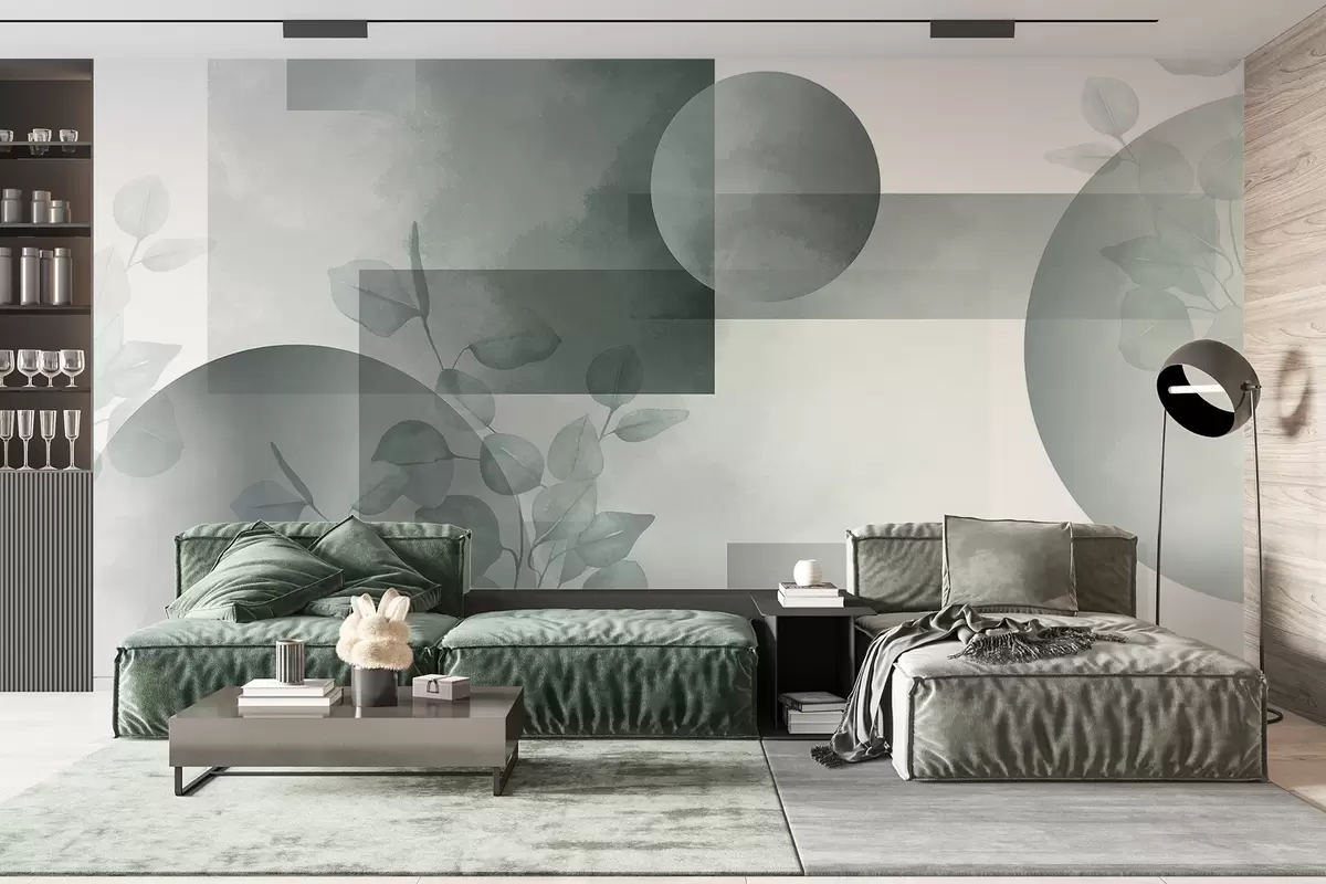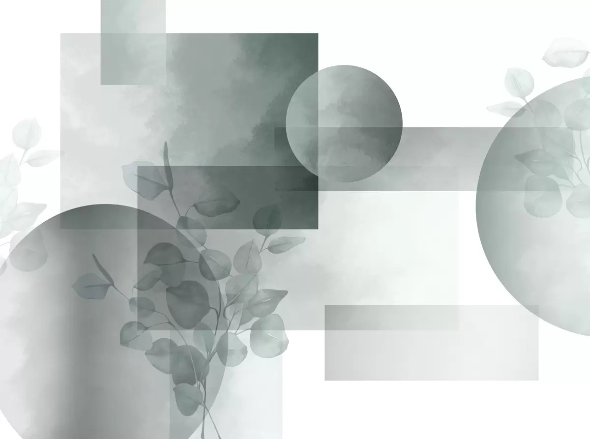Abstract modern minimalistic geometric design with circles and rectangles, eucalyptus leaves, watercolor effect - Wall mural (No. w09110)