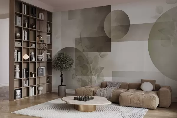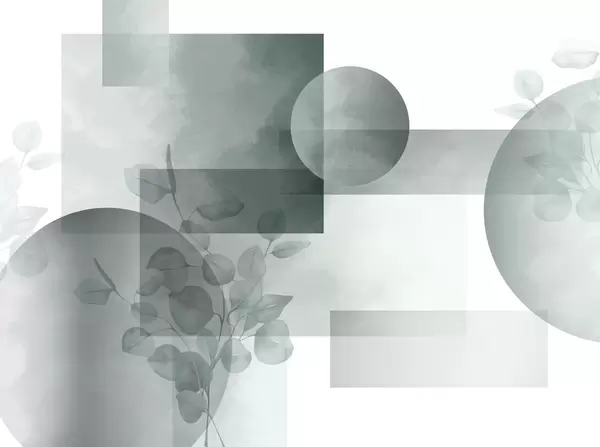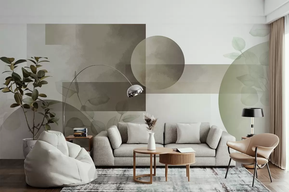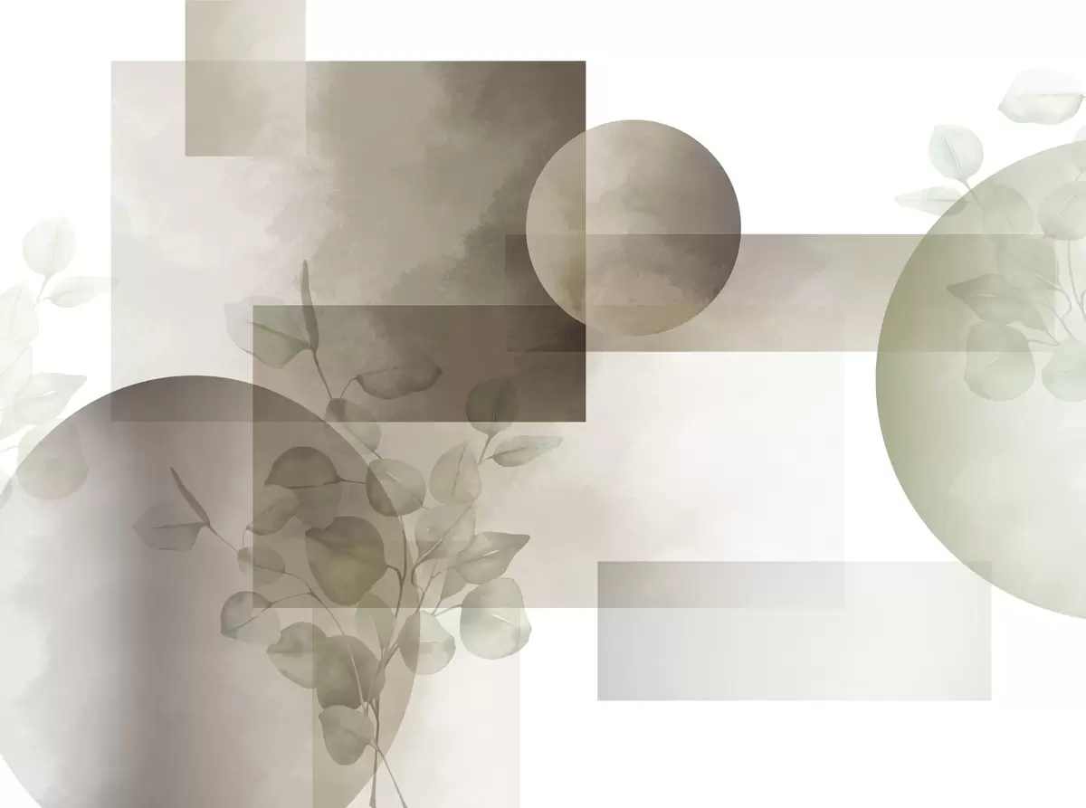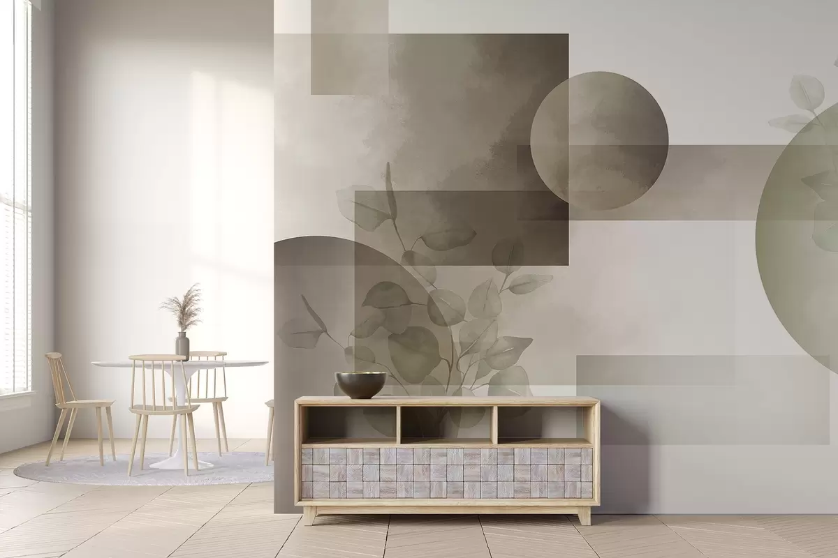 Abstract modern minimalistic geometric design with circles and rectangles, eucalyptus leaves, watercolor effect - Wall mural (No. w09110v1)