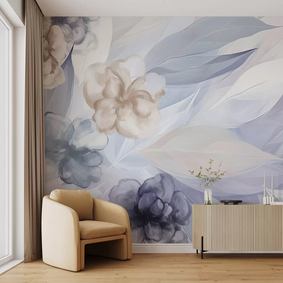 Delicate flowers and leaves in shades of white, blue, purple and beige floral background , soft colors, delicate petals - Wall mural (No. w09111)
