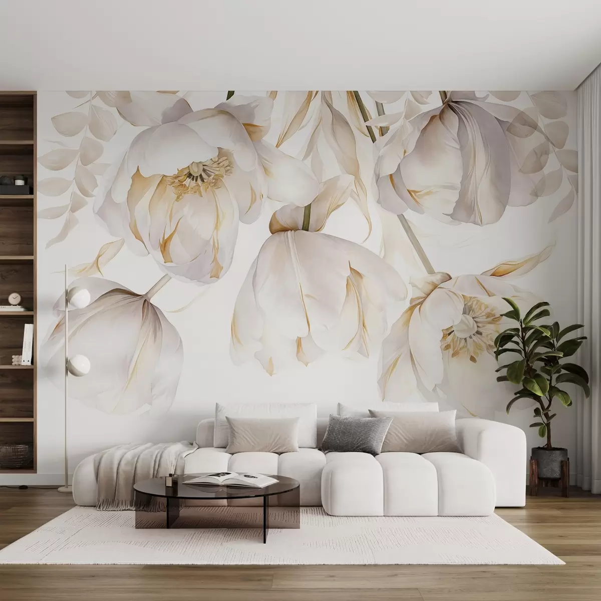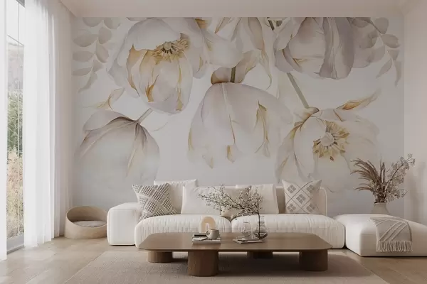 White tulips with yellow pistils, delicate petals, elegant floral arrangement, delicate composition, on a white background - Wall mural (No. w09112)
