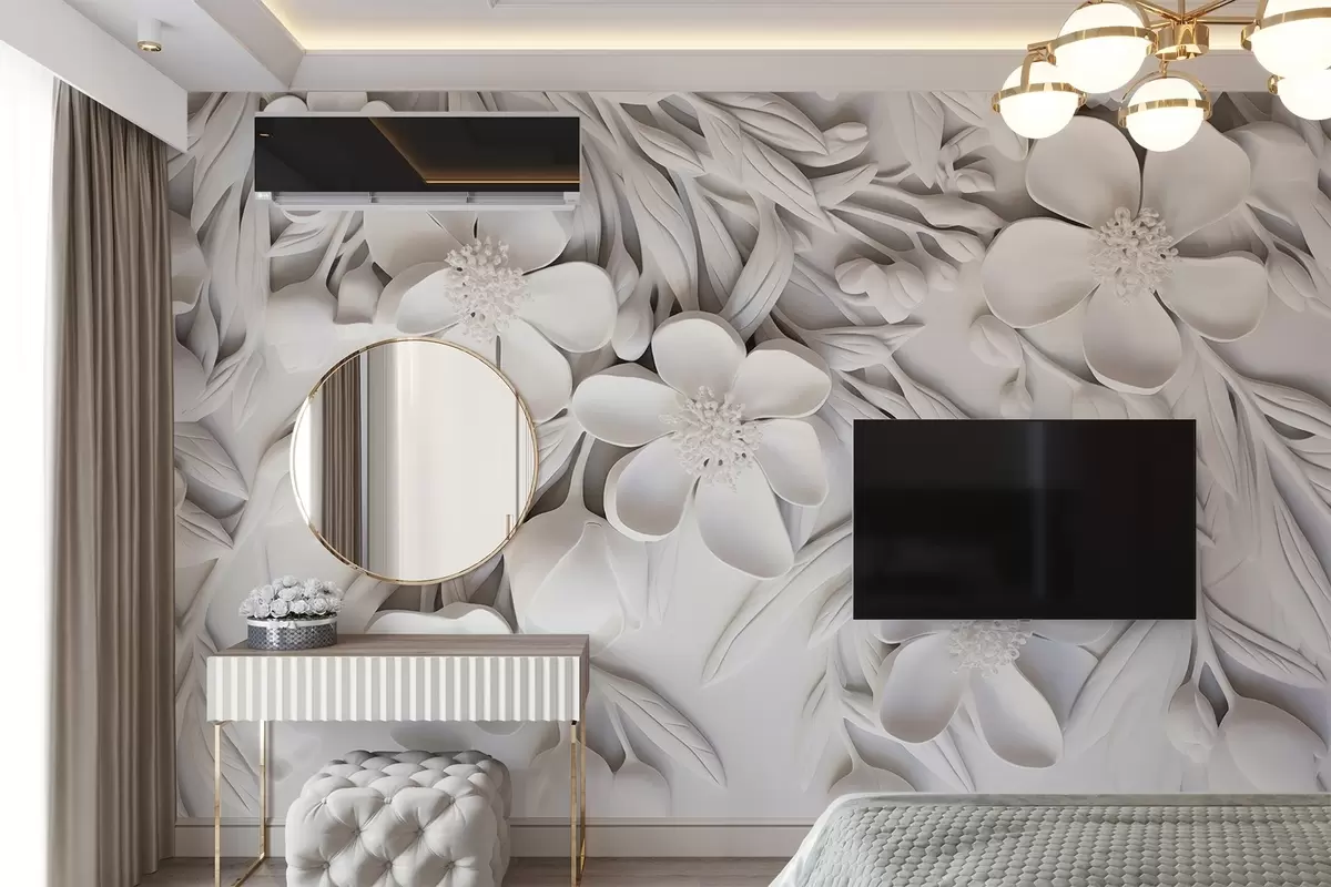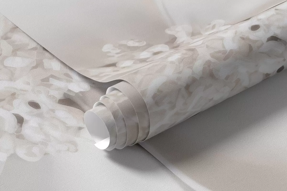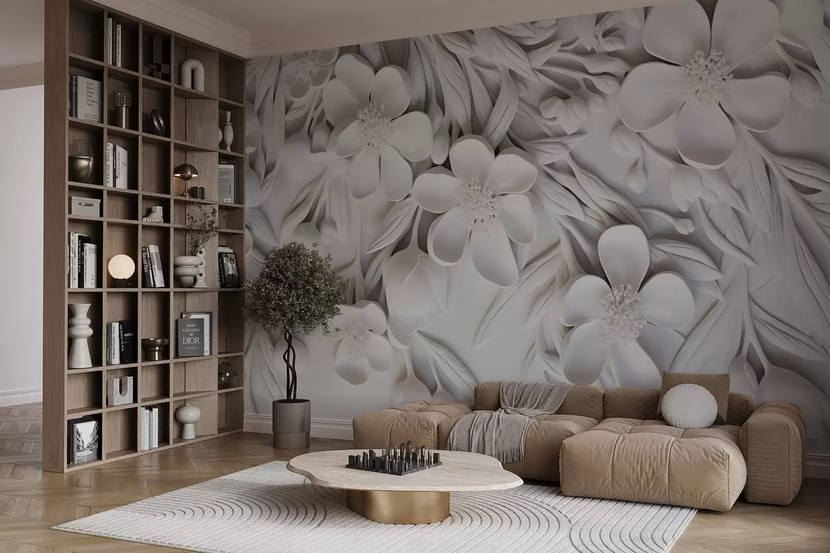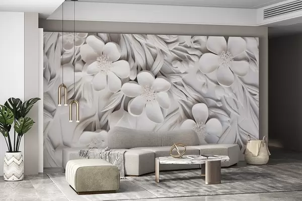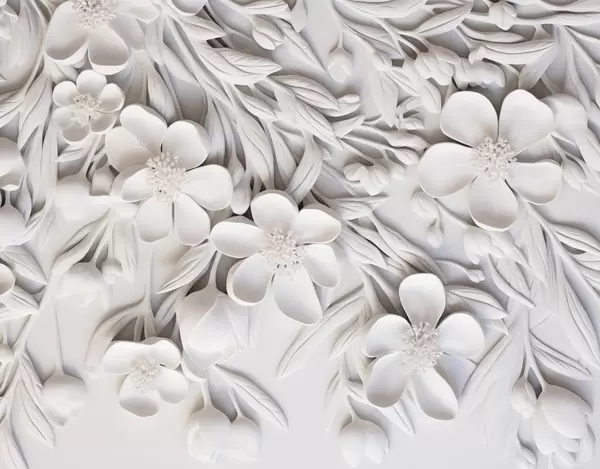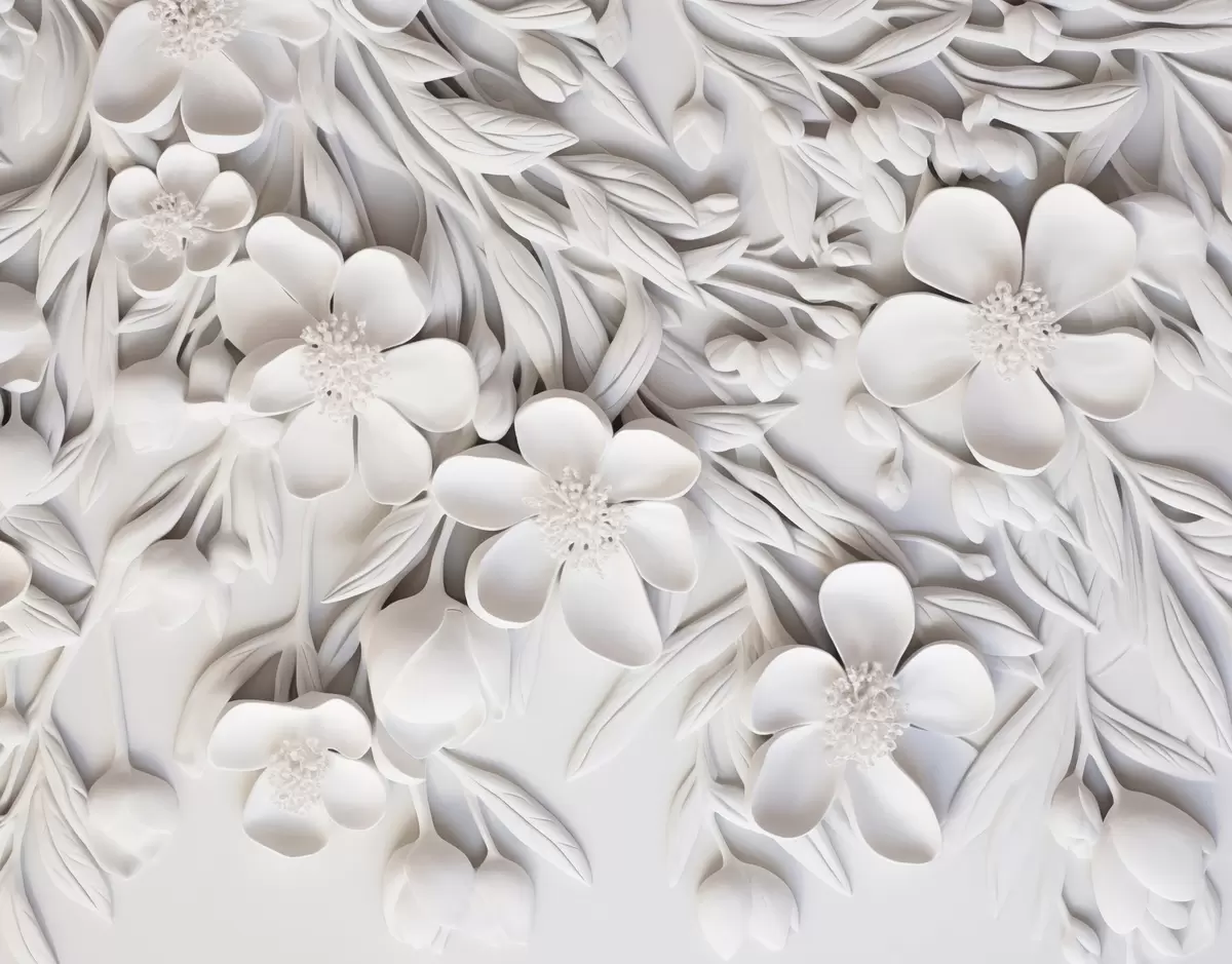 White flowers and leaves in a white background, floral elegant, decorative design, intricate details - Wall mural (No. w09113)