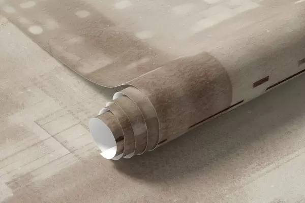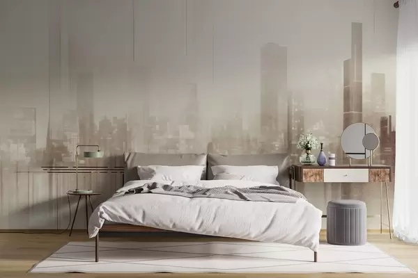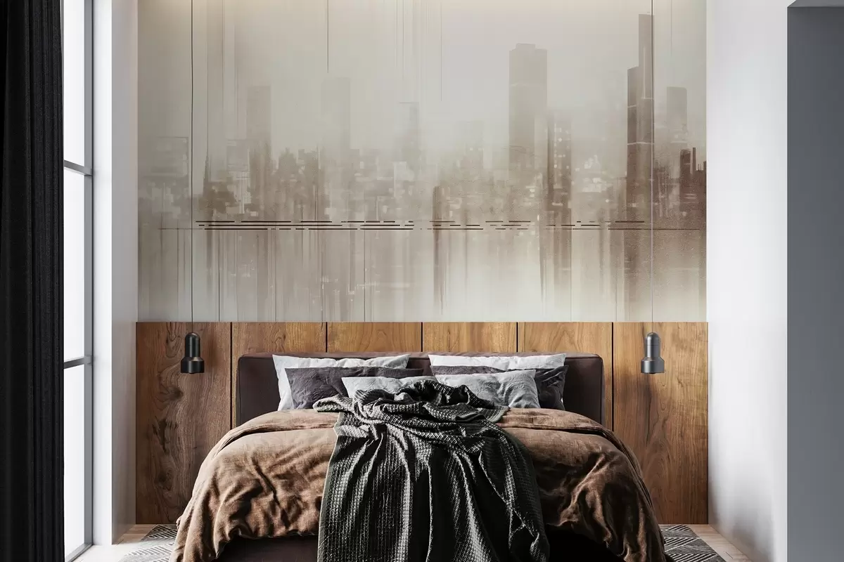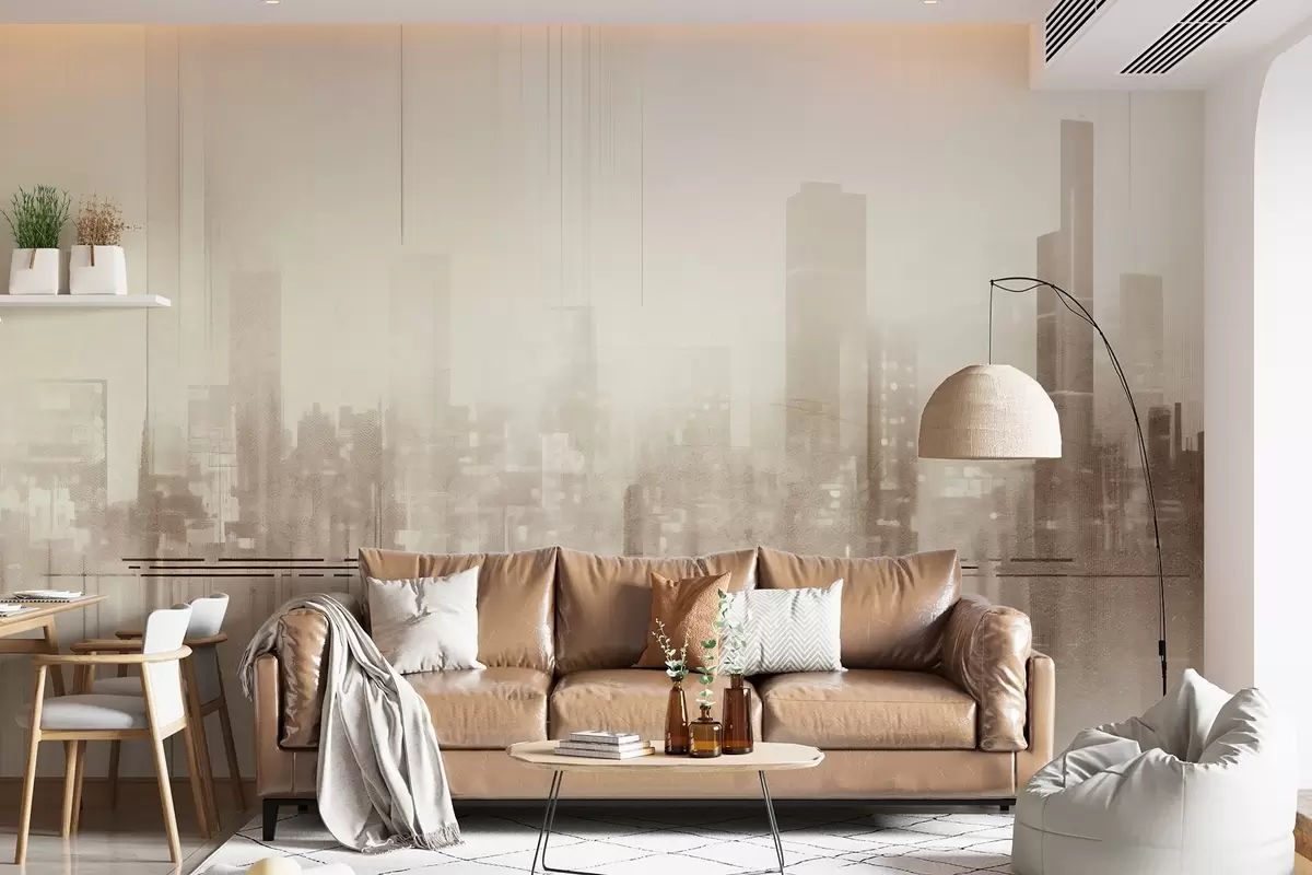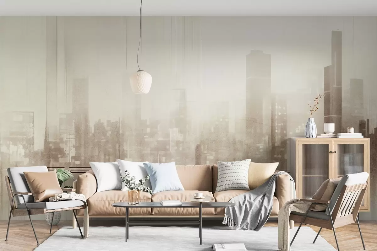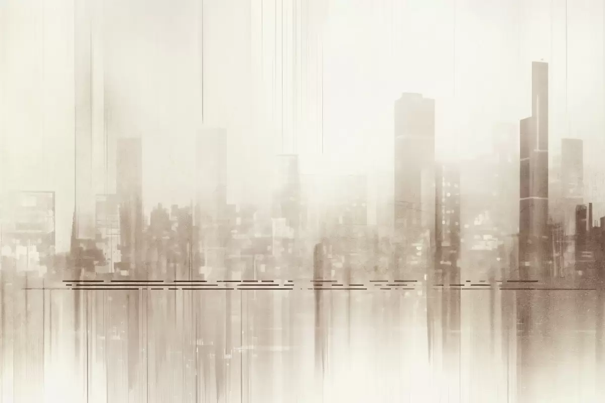 Abstract textured cityscape with tall buildings and strips, in shades of beige and white, creating a hazy effect - Wall mural (No. w09119v1)