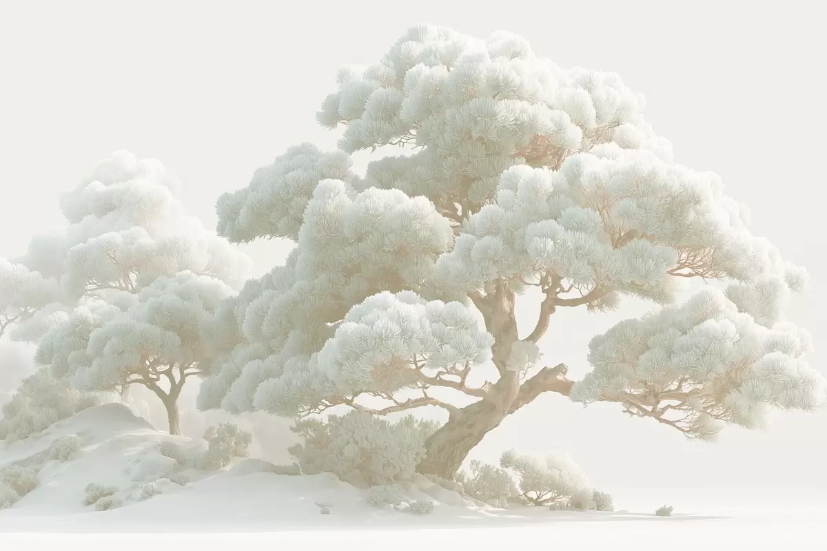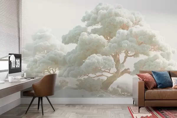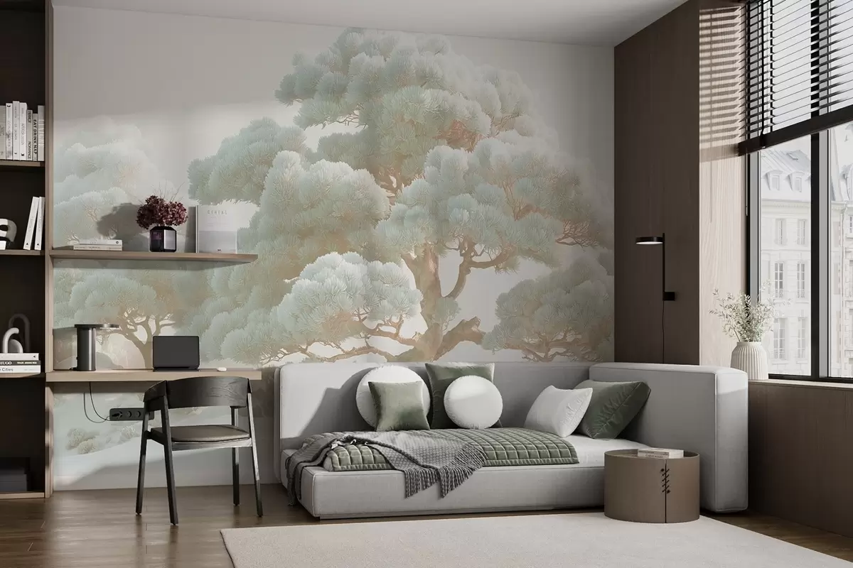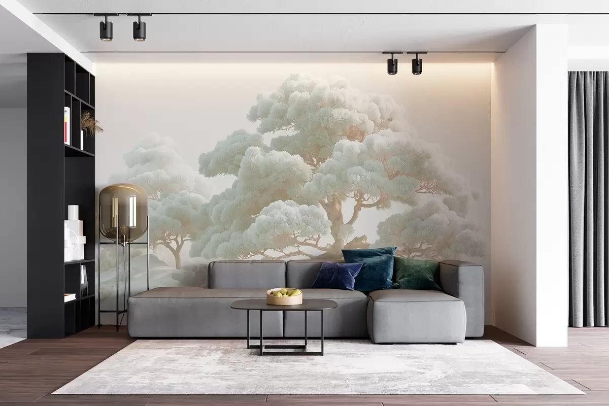 Pine trees in the mist in soft tones standing in a forest - Wall mural (No. w09122)