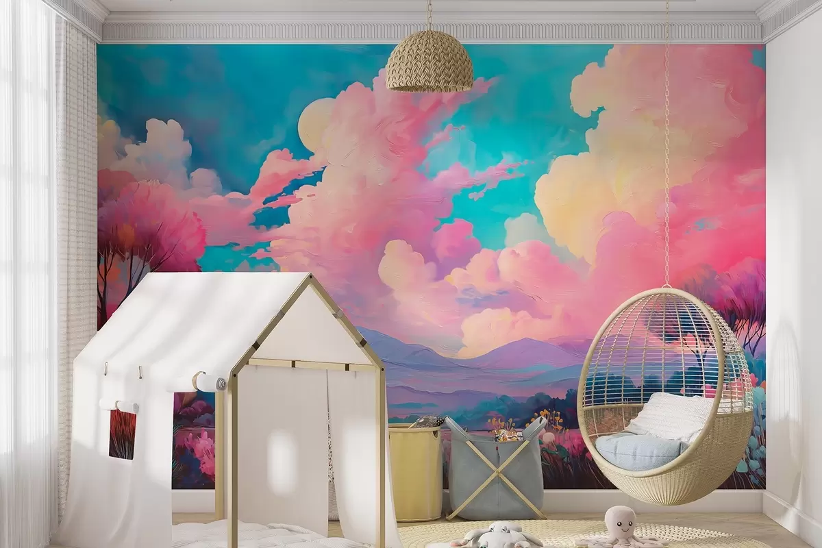 Colorful landscape in oil painting style with a pink sky, plants, and trees - Wall mural (No. w09123)