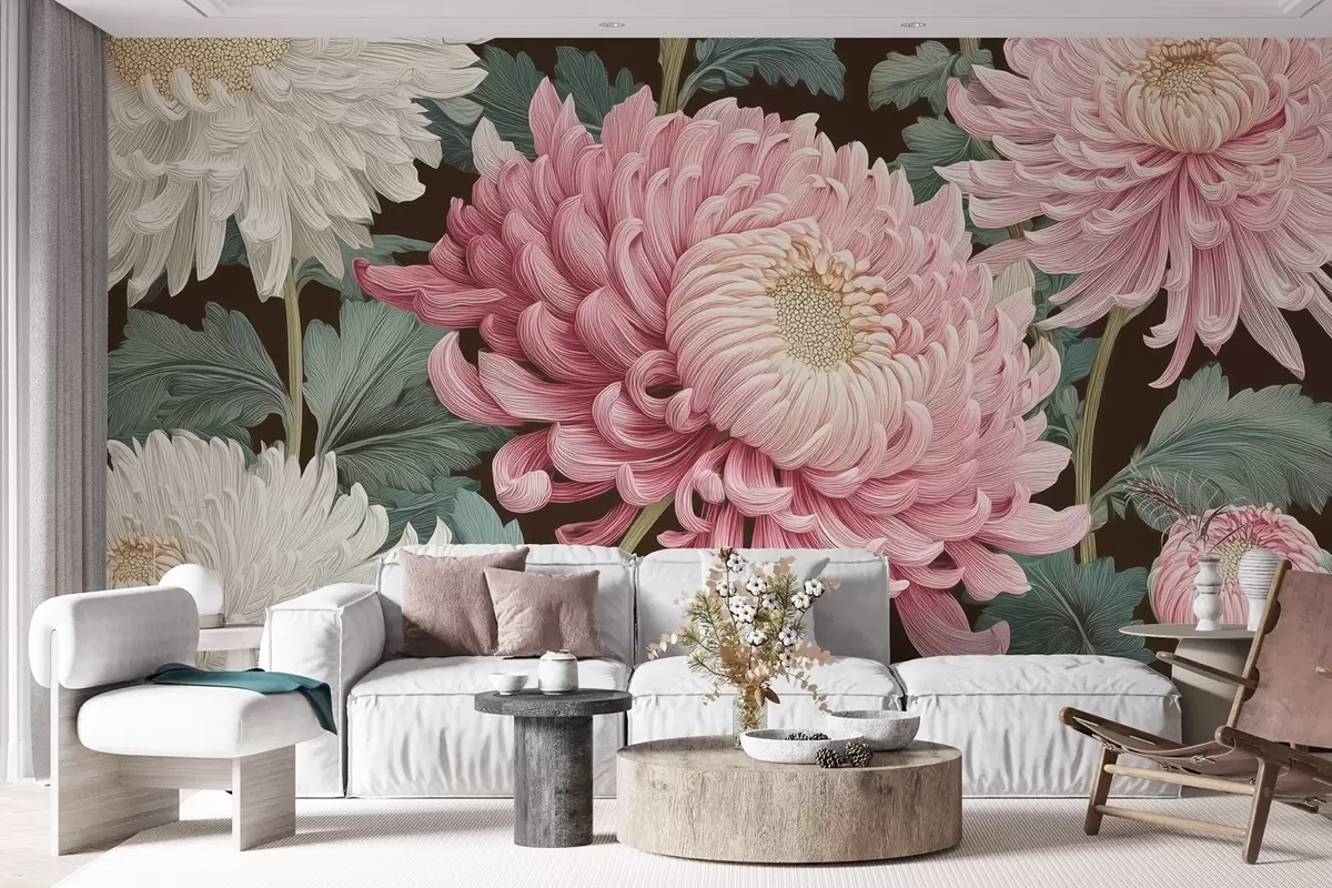 Pink and white large orchids with leaves on a dark background - Wall mural (No. w09125)