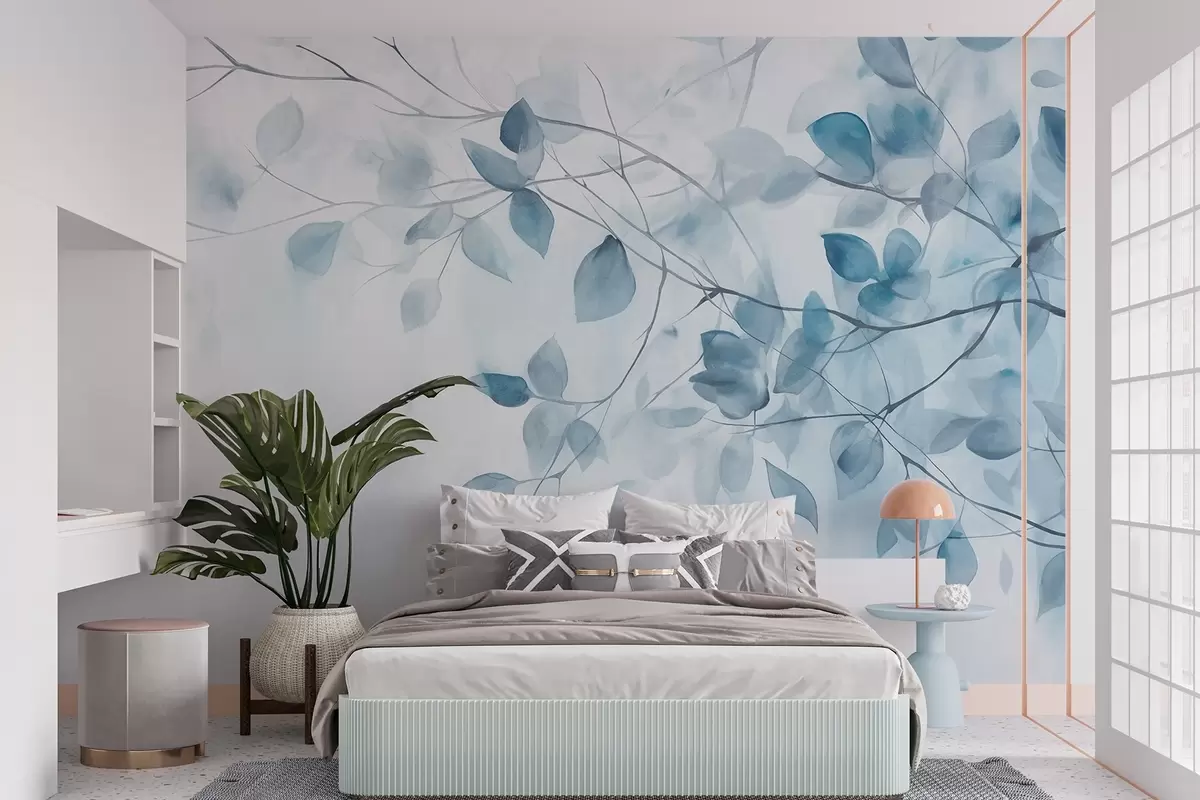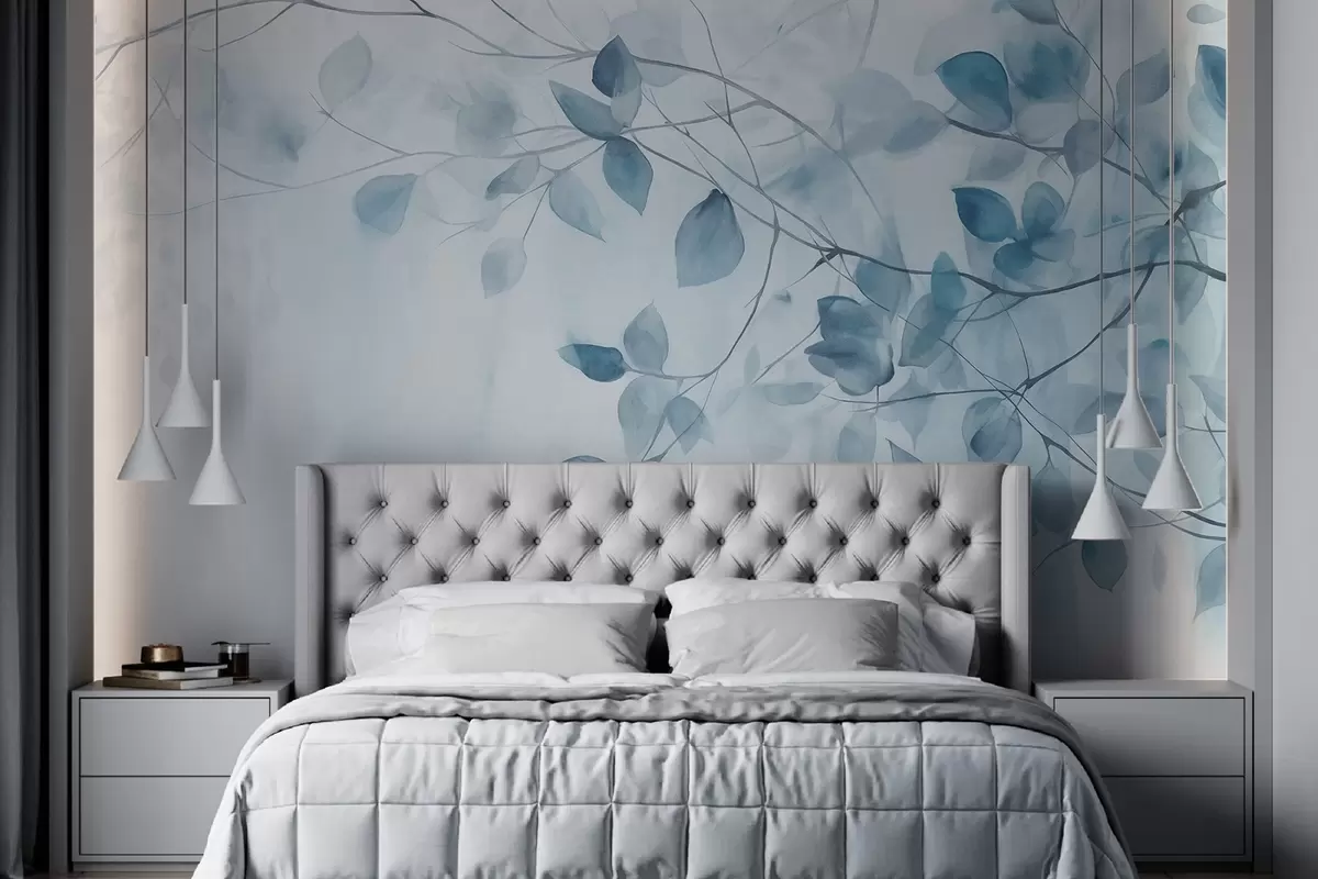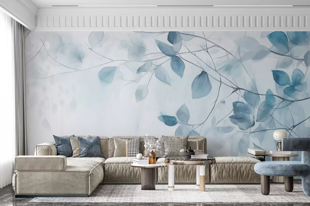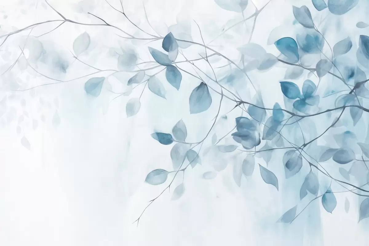 Textural watercolor painting imitation of blue leaves and branches, soft colors, delicate details against a white background - Wall mural (No. w09133v1)