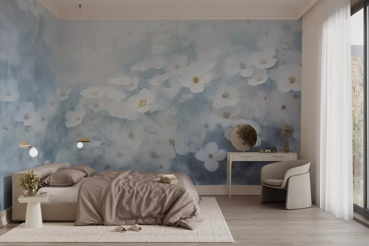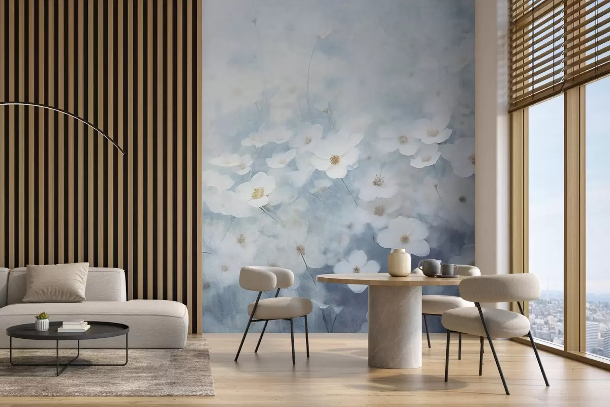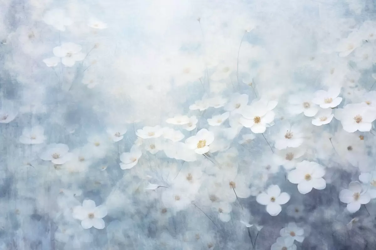 Textural field of white anemone flowers, soft focus, dreamy atmosphere, light blue and white color palette, spring meadow - Wall mural (No. w09134)