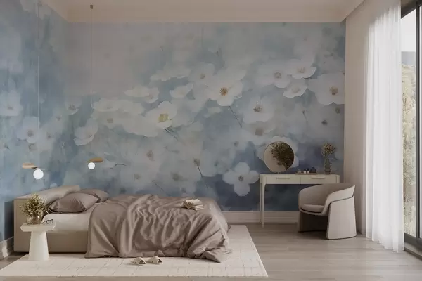 wall murals Textural field of white anemone flowers, soft focus, dreamy atmosphere, light blue and white color palette, spring meadow w09134