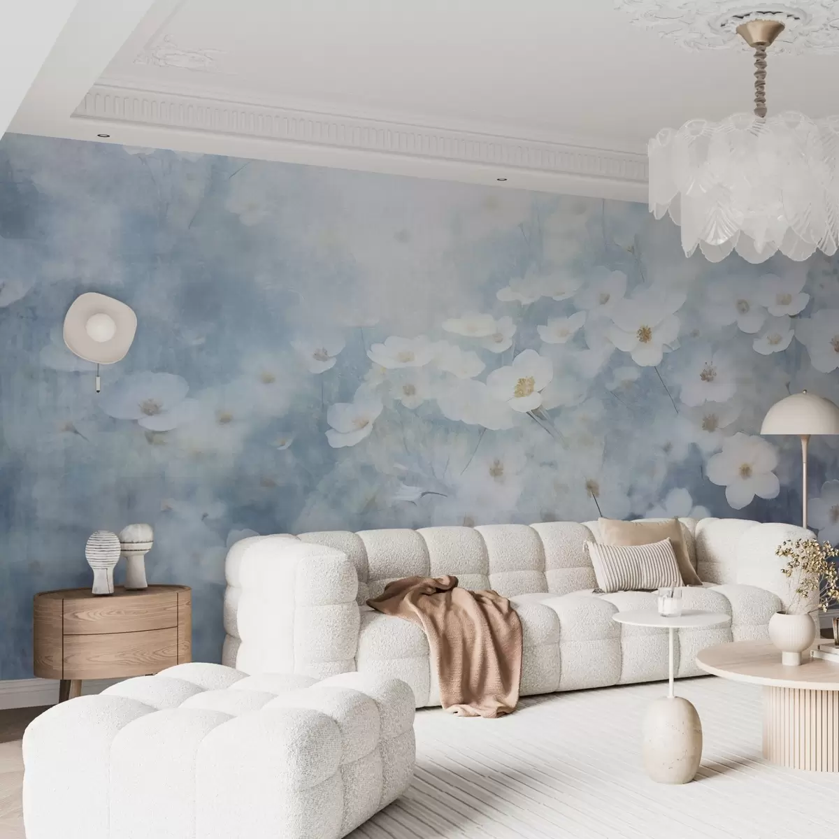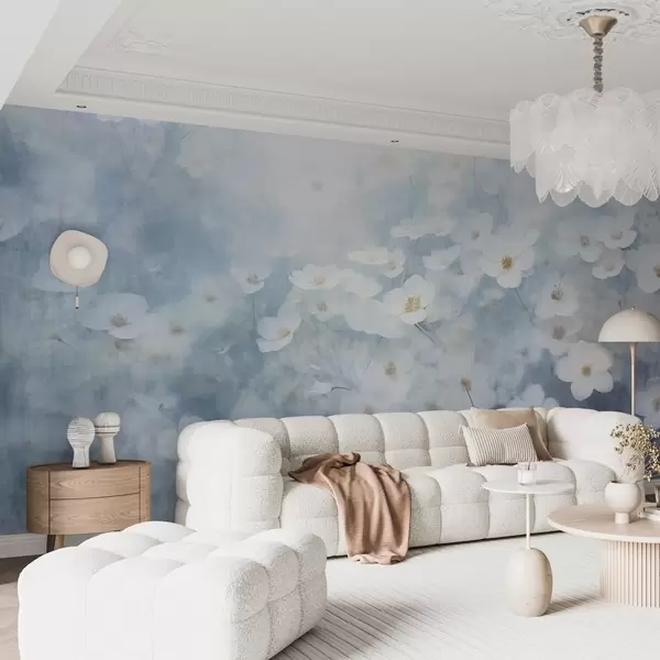Textural field of white anemone flowers, soft focus, dreamy atmosphere, light blue and white color palette, spring meadow - Wall mural (No. w09134)