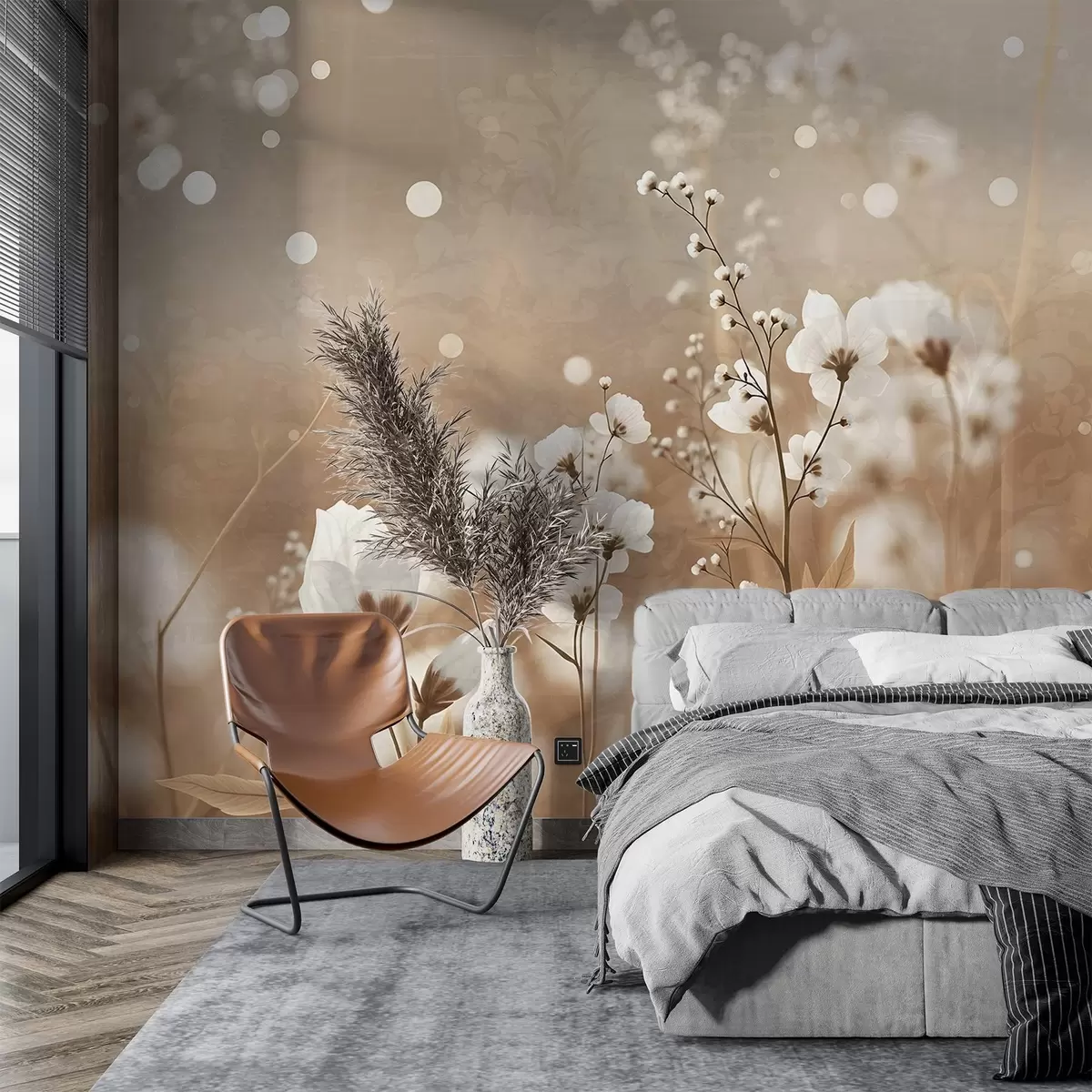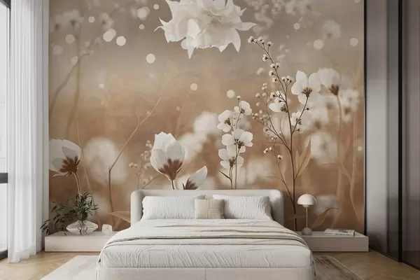 White flowers with brown stems and leaves in a field, bokeh effect, warm color palette, elegant nature-inspired artwork - Wall mural (No. w09135)