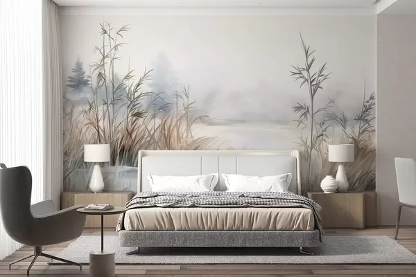 Textured landscape of a lake with tall grasses in the foreground, soft blue and brown, calm water, trees in the distance - Wall mural (No. w09137)