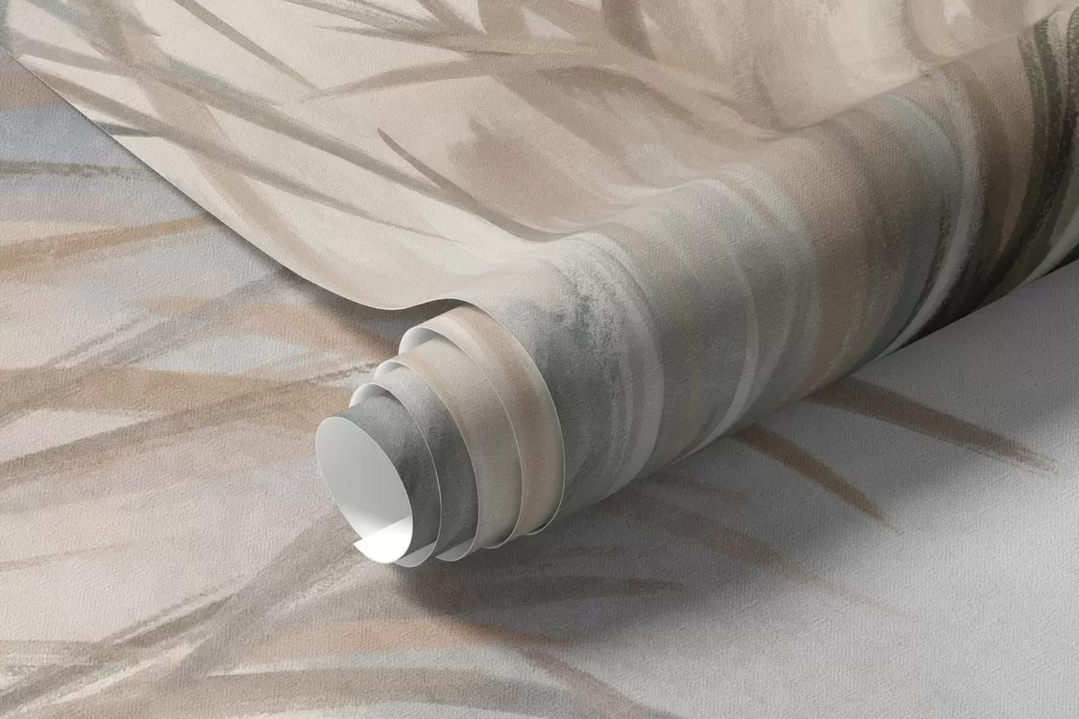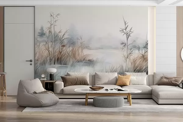 Textured landscape of a lake with tall grasses in the foreground, soft blue and brown, calm water, trees in the distance - Wall mural (No. w09137)