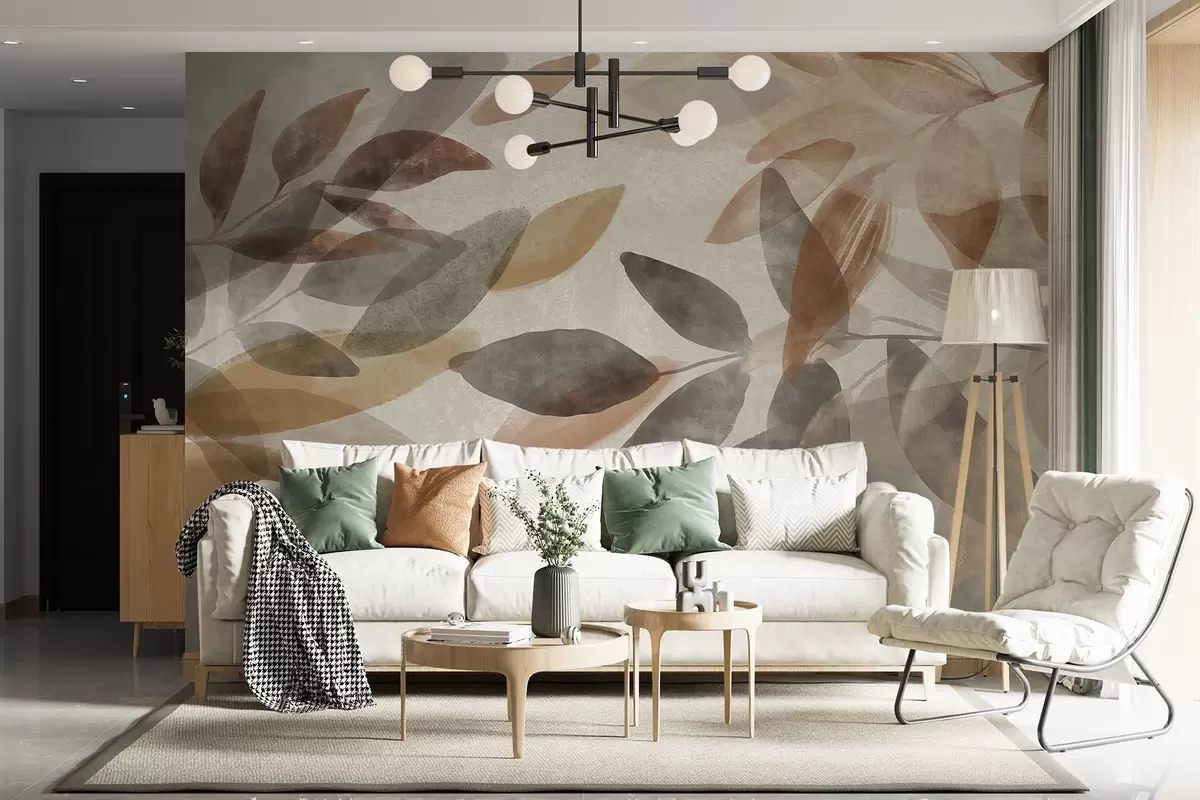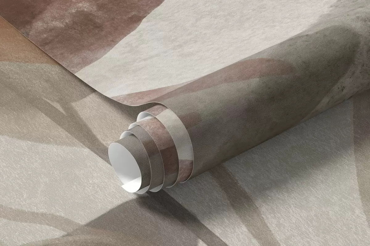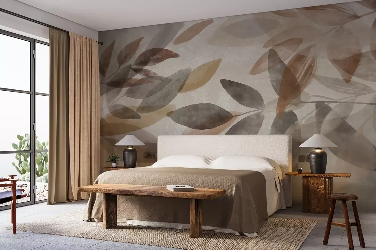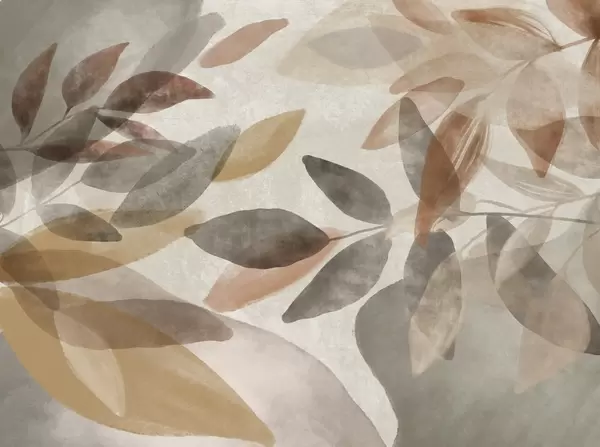 Abstract textured leaves in muted brown, beige and gray tones, transparent shapes, minimalist style, organic shapes - Wall mural (No. w09140)