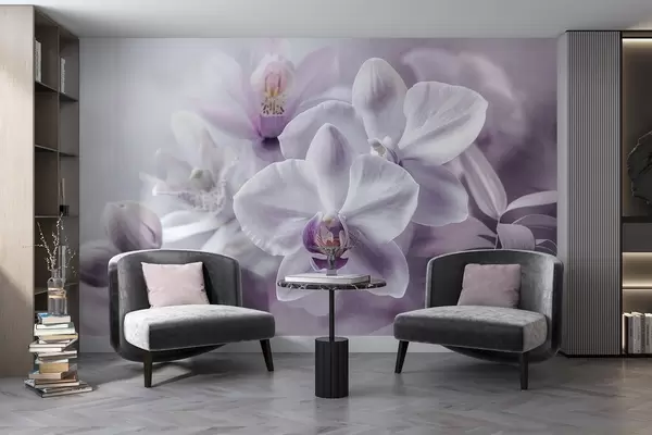 White and lilac delicate orchid flowers, soft lighting, and a blurred textured background - Wall mural (No. w09155)