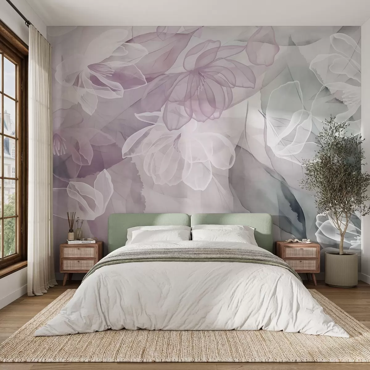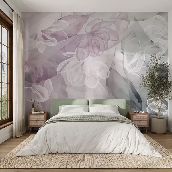 Flowers and leaves with transparent petals in shades of white, pink and green, soft and delicate - Wall mural (No. w09158v1)