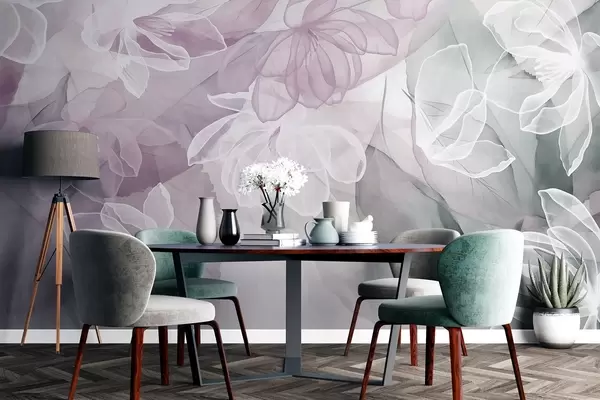 Flowers and leaves with transparent petals in shades of white, pink and green, soft and delicate - Wall mural (No. w09158v1)