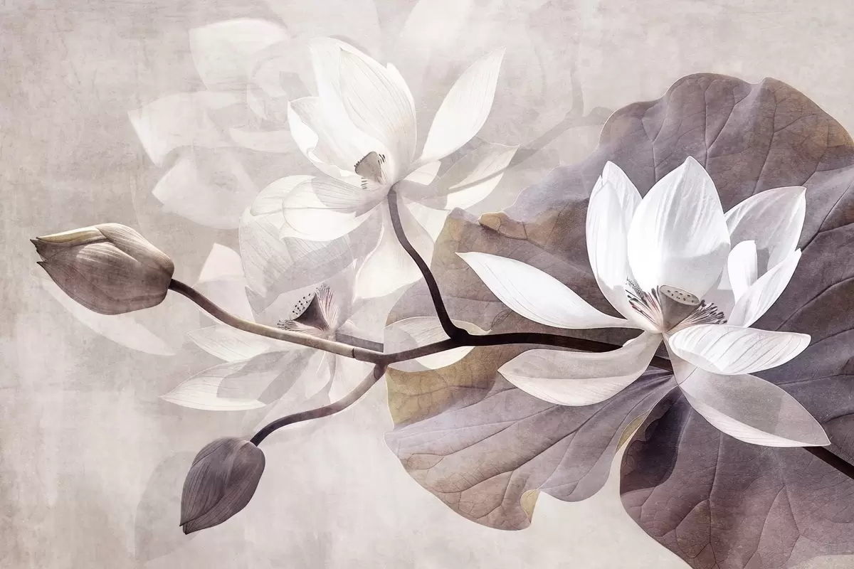 Grainy textured muted delicate lotus flowers with leaves and stems in a soft, beige color palette - Wall mural (No. w09159)