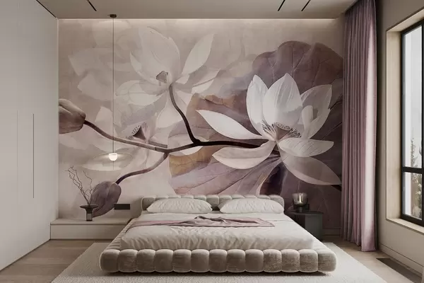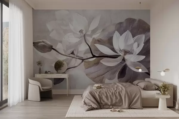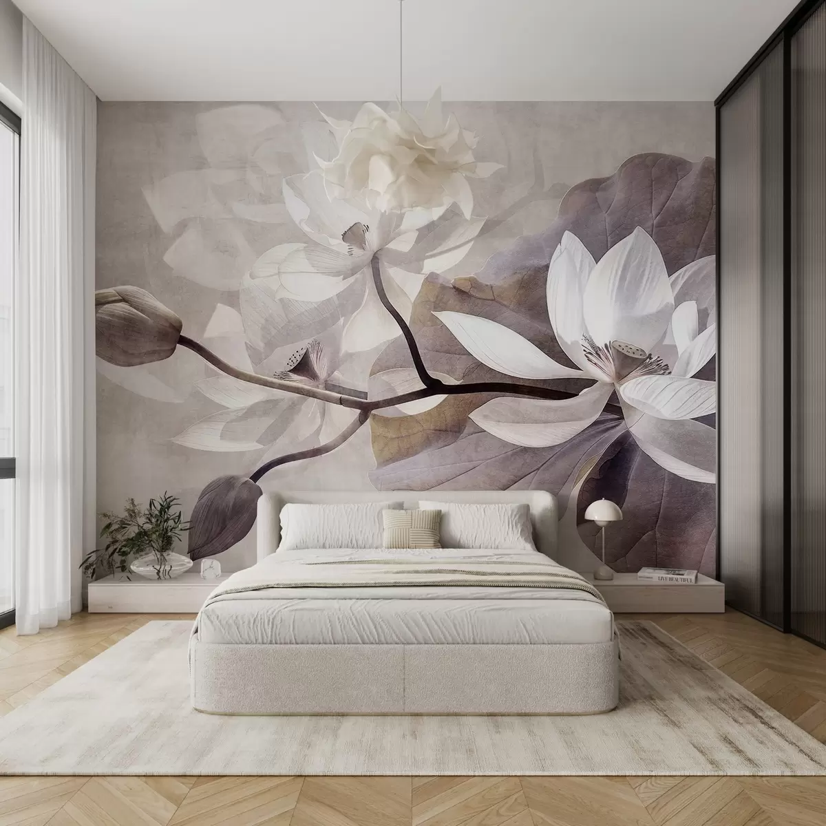 Grainy textured muted delicate lotus flowers with leaves and stems in a soft, beige color palette - Wall mural (No. w09159)
