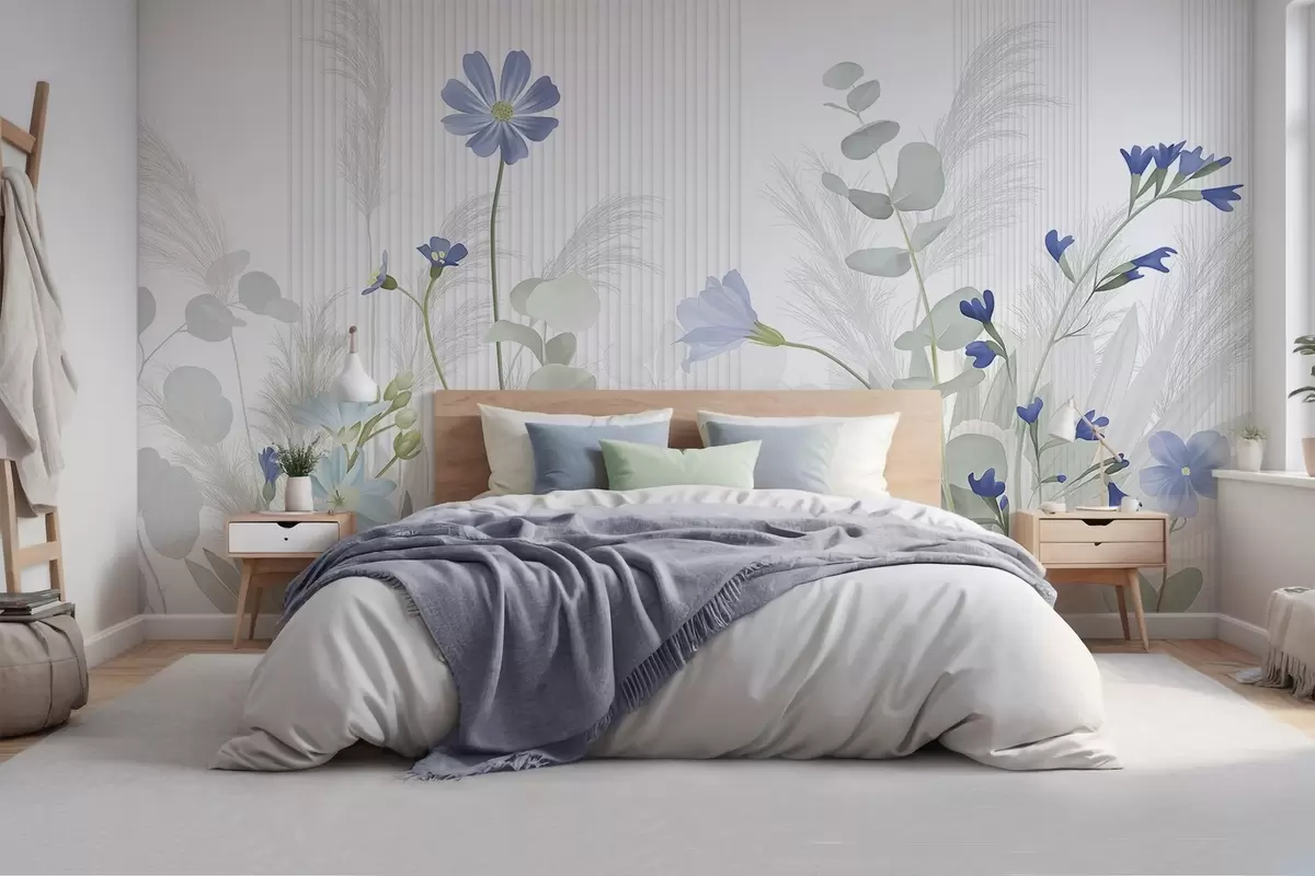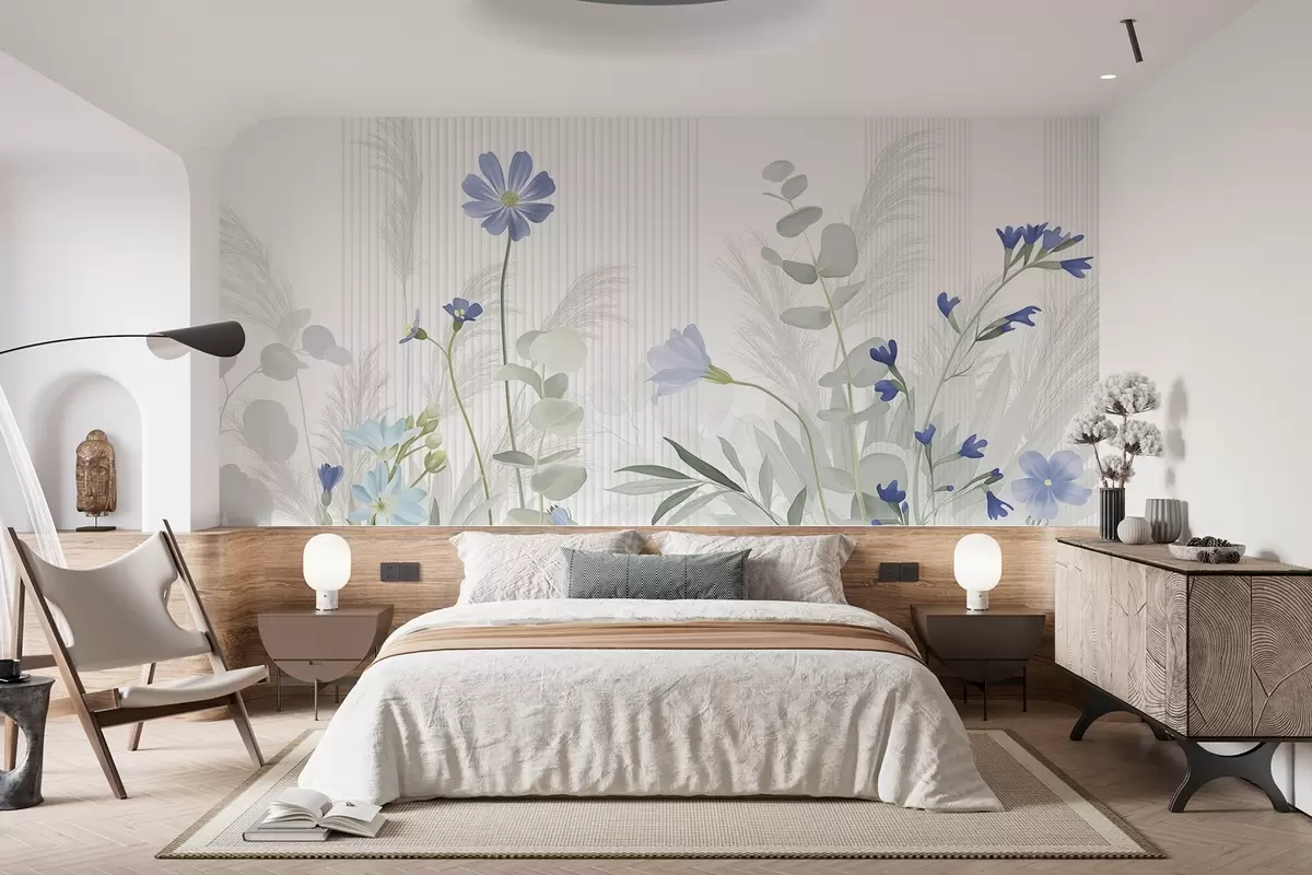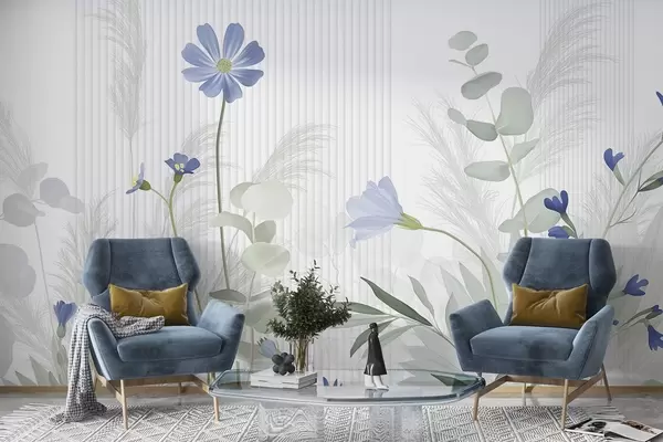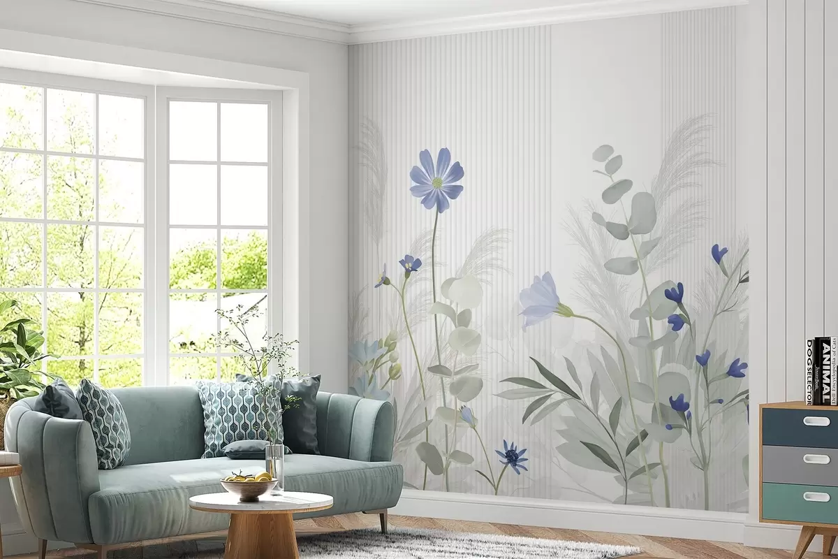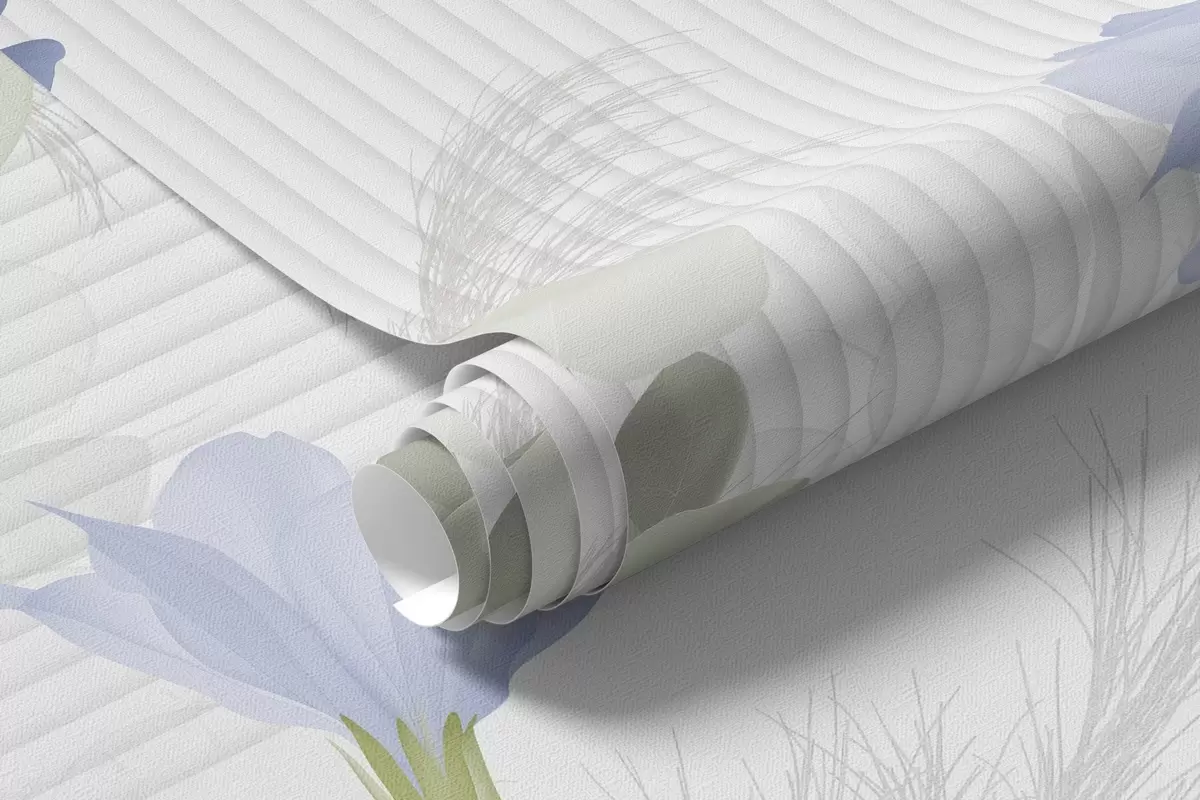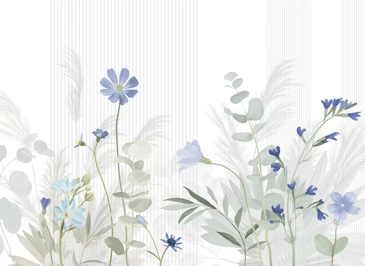 Flowers in pastel colors, light green leaves, white background with vertical lines, elegant and minimalist - Wall mural (No. w09161v1)