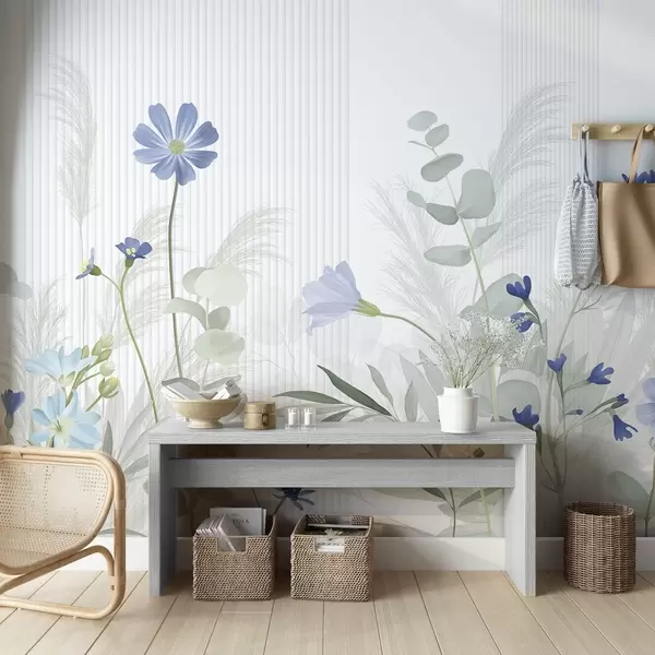 Flowers in pastel colors, light green leaves, white background with vertical lines, elegant and minimalist - Wall mural (No. w09161v1)