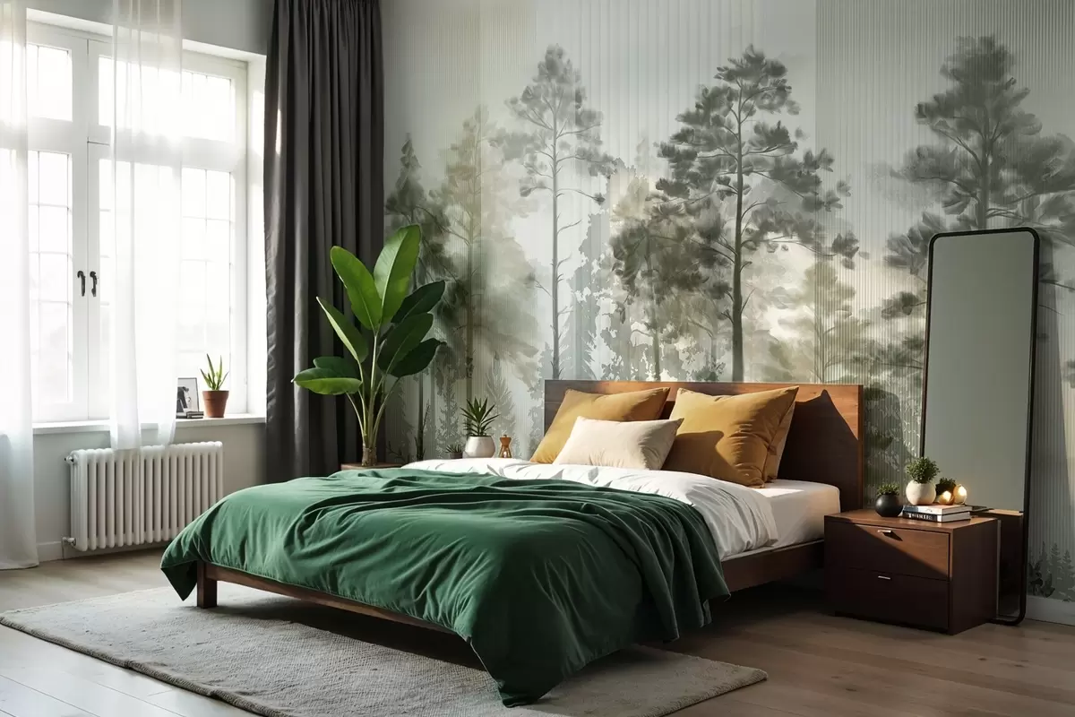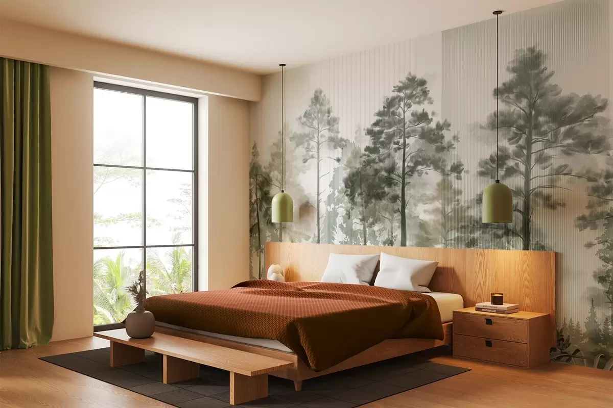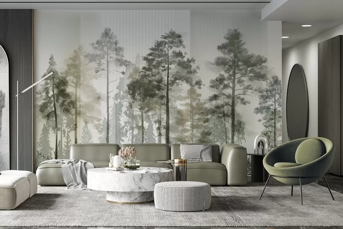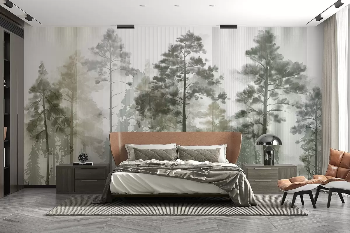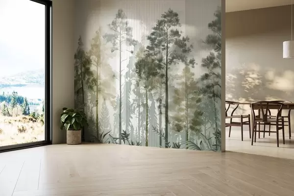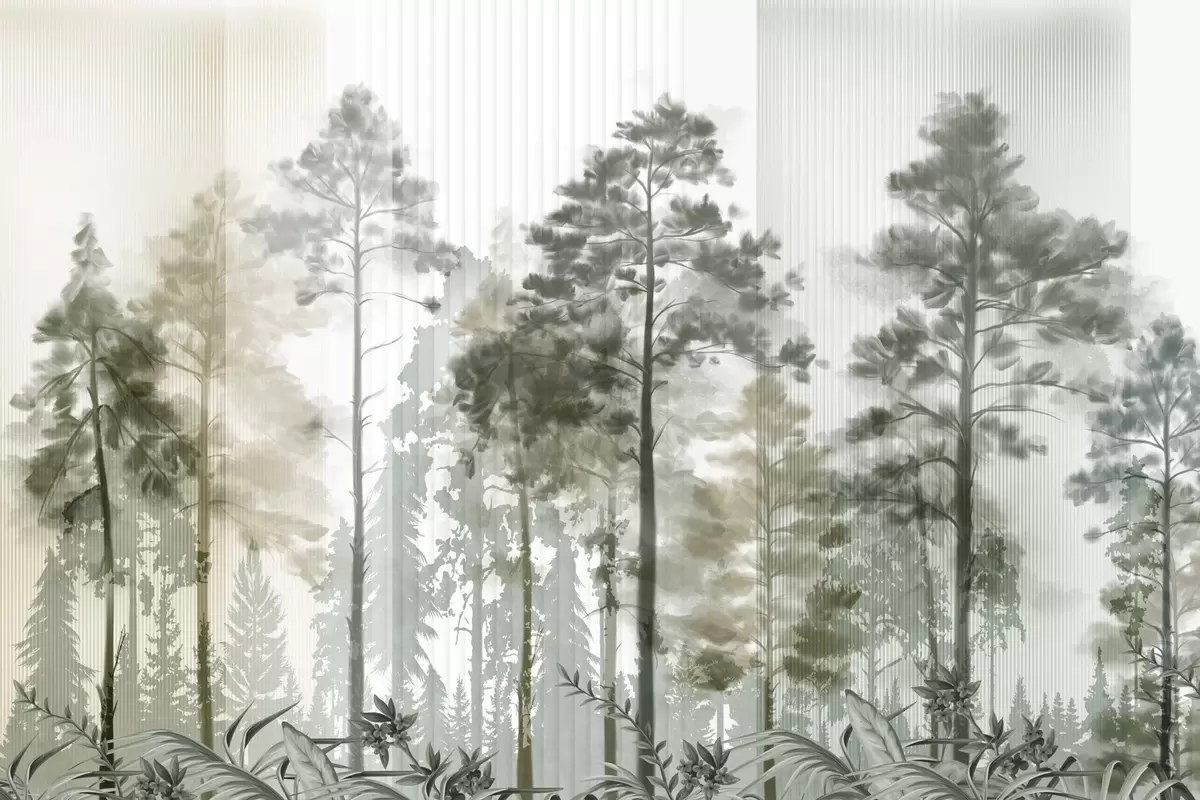 A dense forest with tall pine trees, lush green foliage, a misty atmosphere with vertical lines textures - Wall mural (No. w09163)