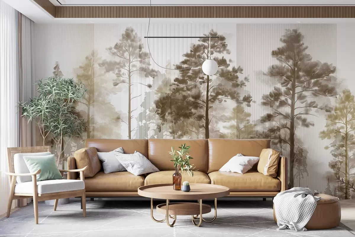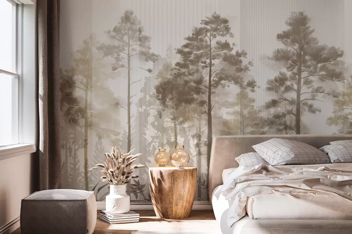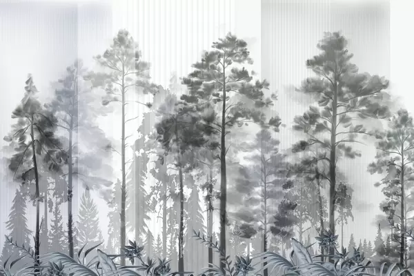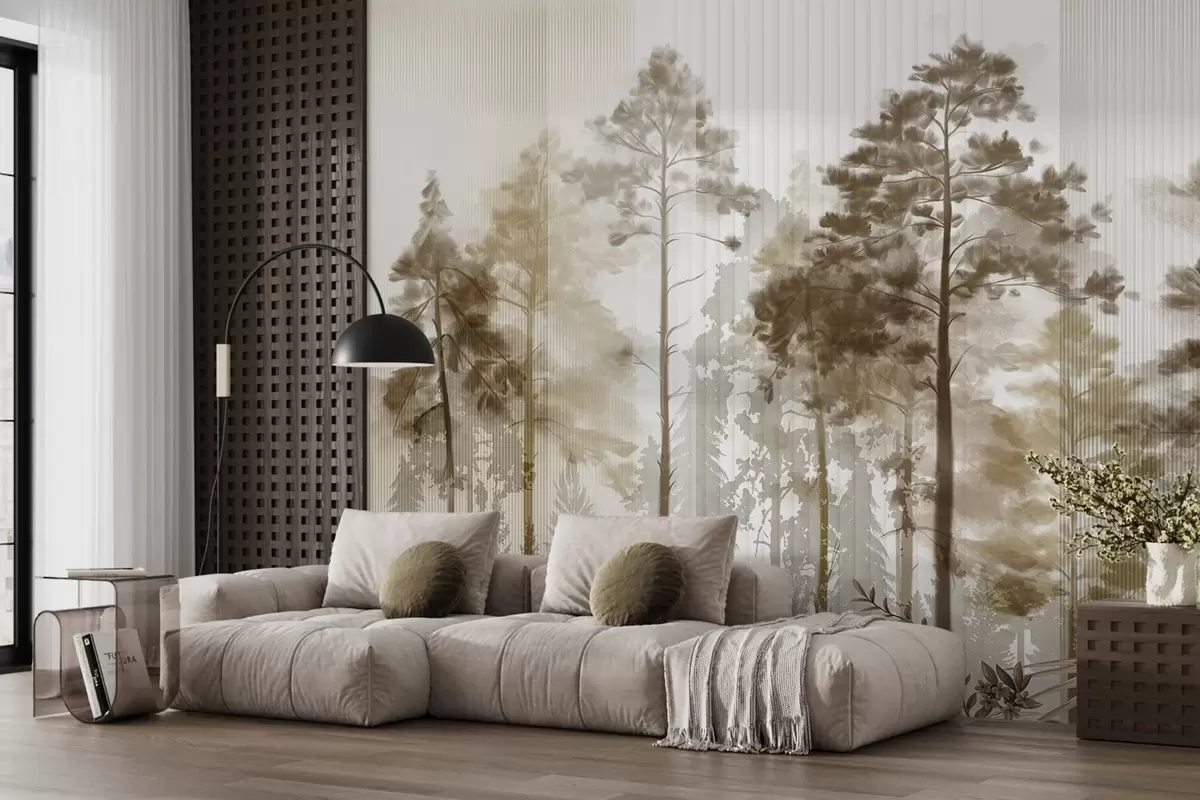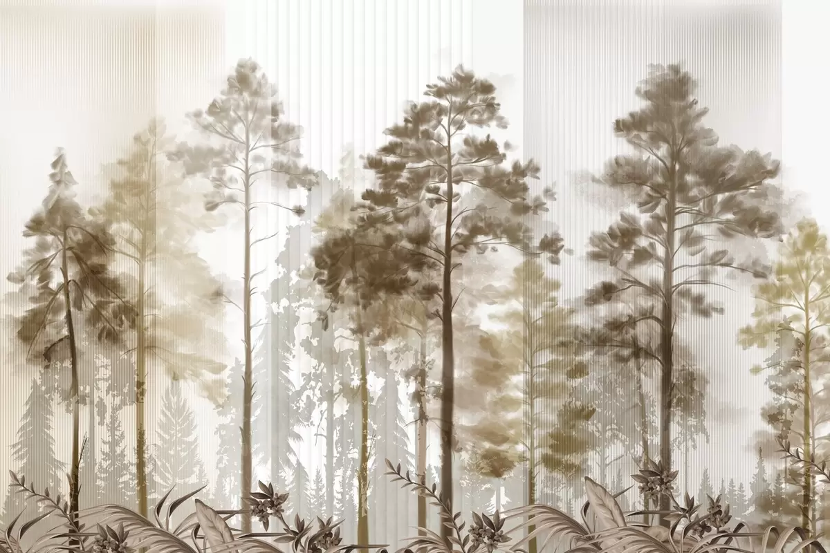 A dense forest with tall pine trees, lush beige foliage, a misty atmosphere with vertical lines textures - Wall mural (No. w09163v1)