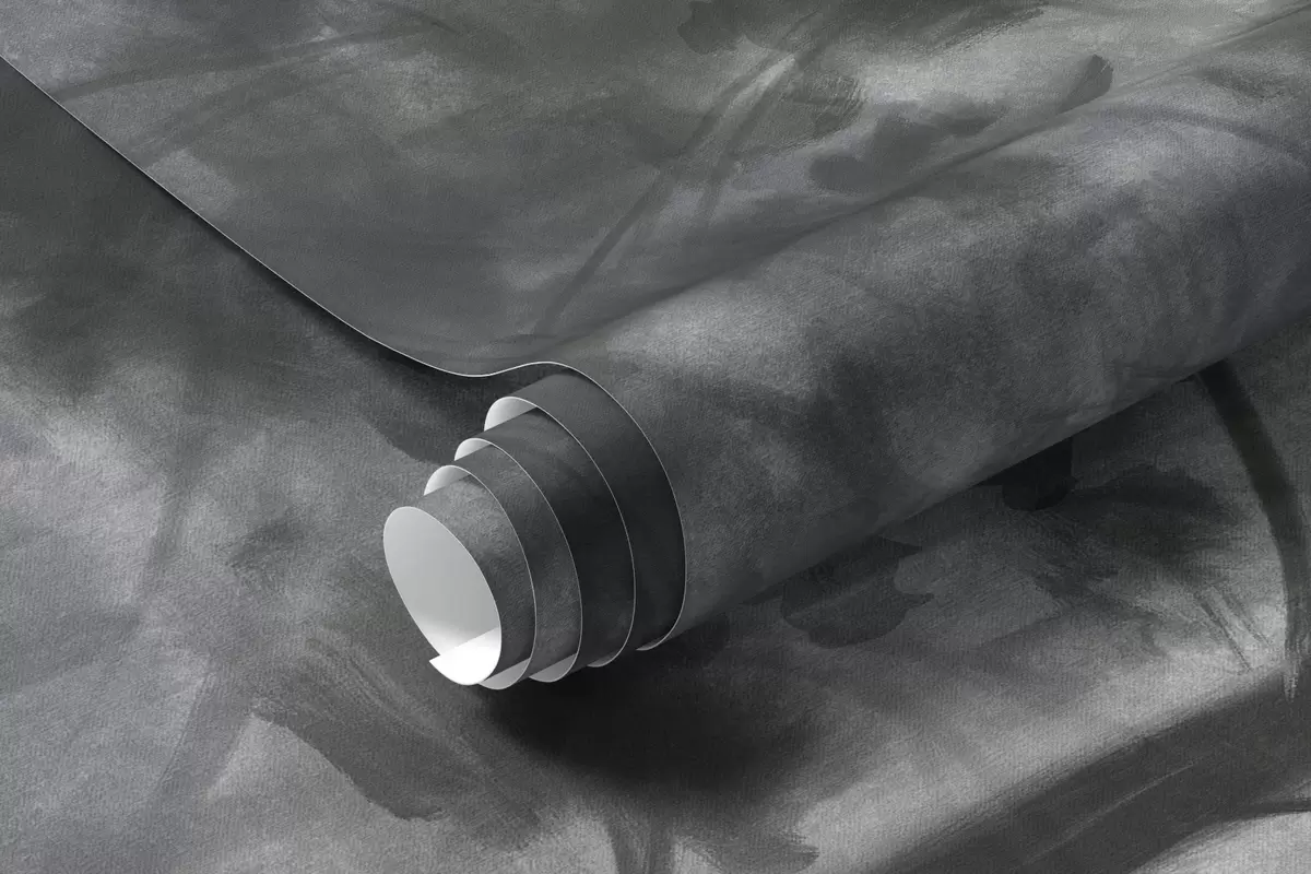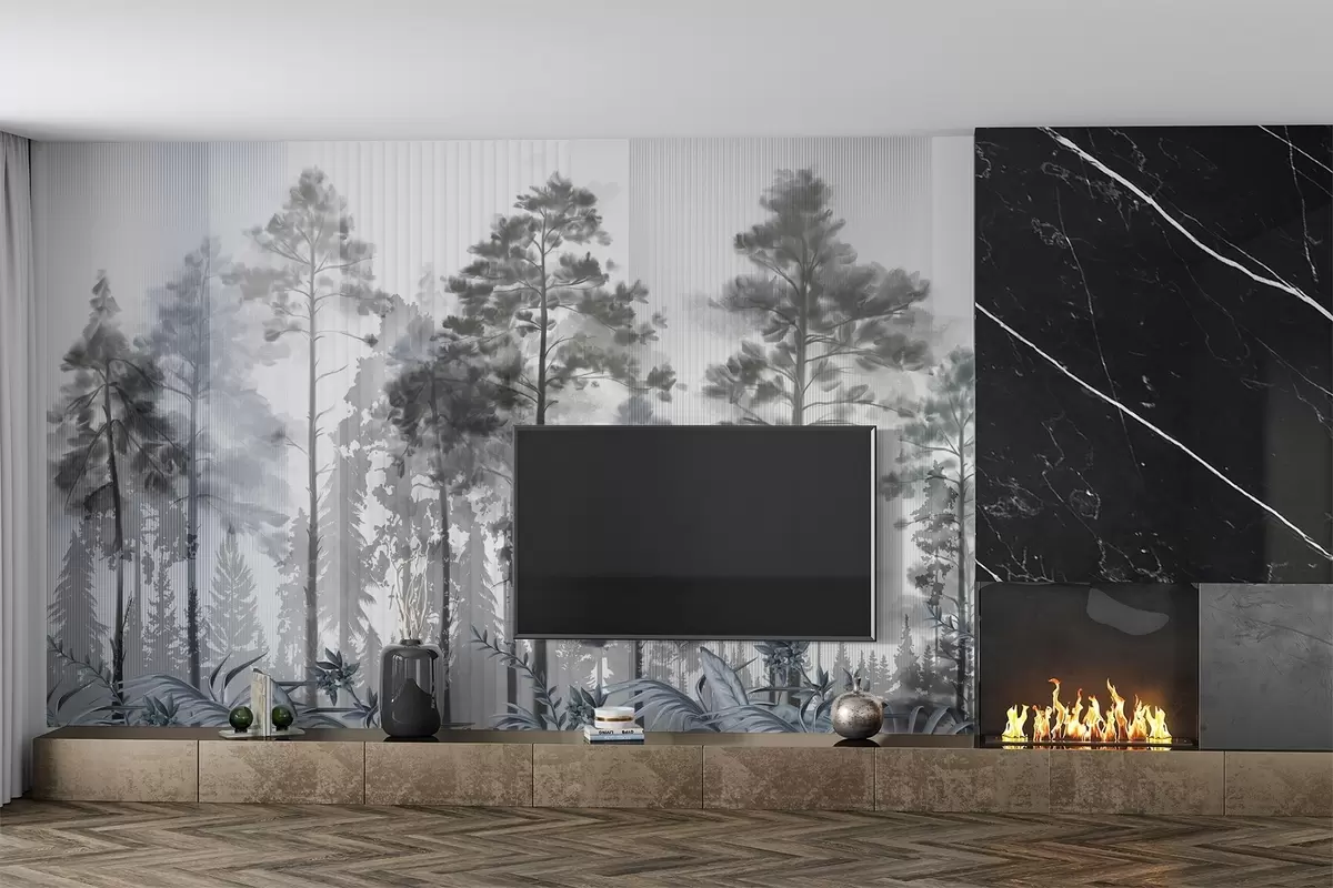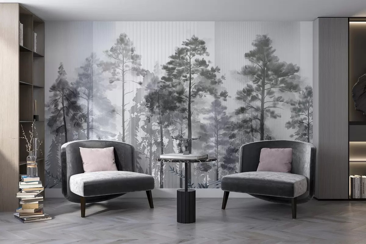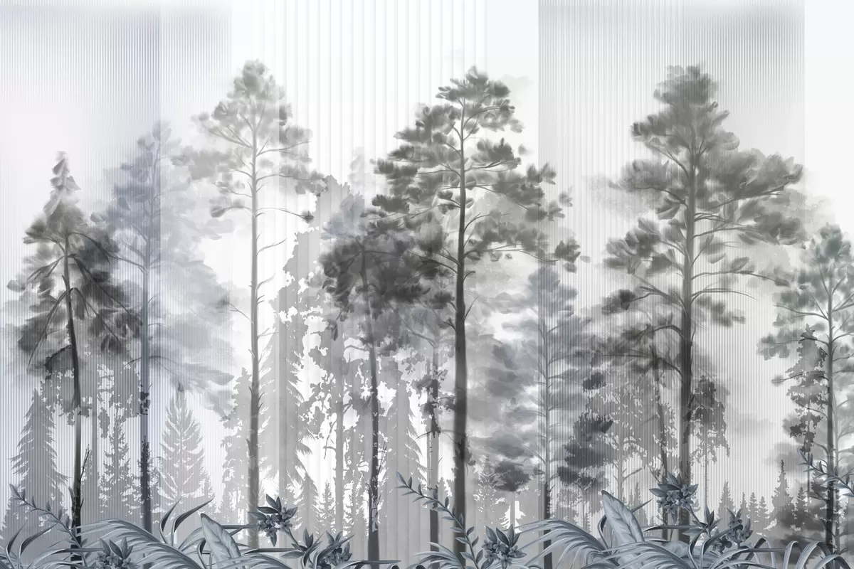 A dense forest with tall pine trees, lush gray foliage, a misty atmosphere with vertical lines textures - Wall mural (No. w09163v2)