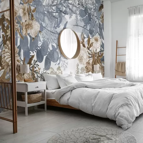 Vintage floral arrangement with roses, eucalyptus, and mimosa in shades of blue and brown - Wall mural (No. w09164)