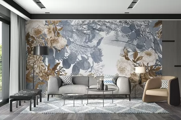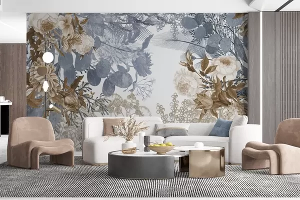 Vintage floral arrangement with roses, eucalyptus, and mimosa in shades of blue and brown - Wall mural (No. w09164)
